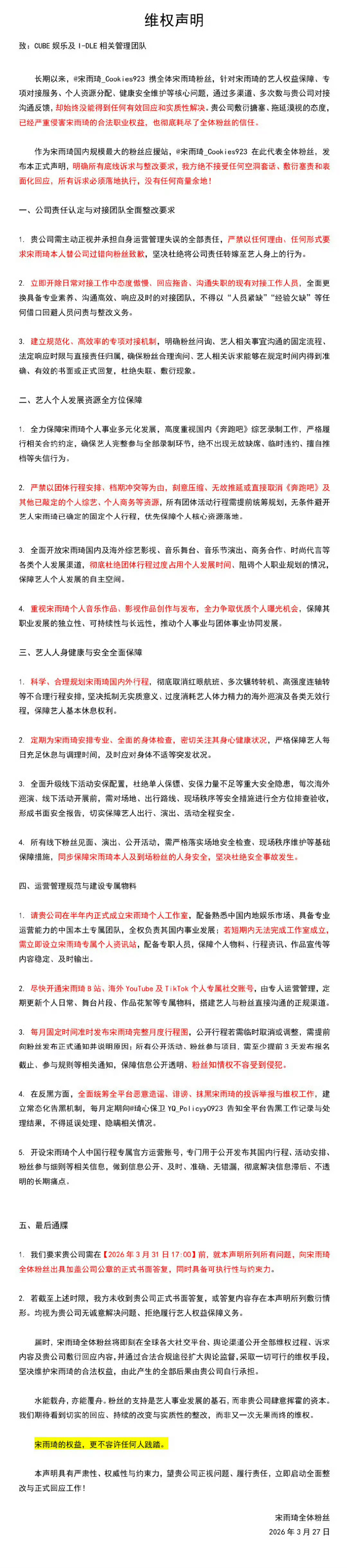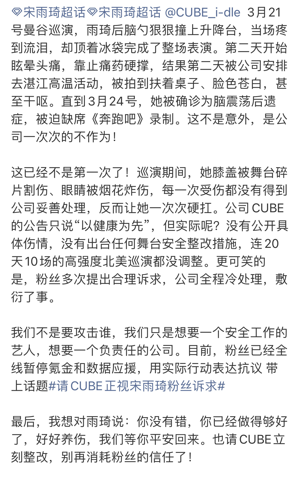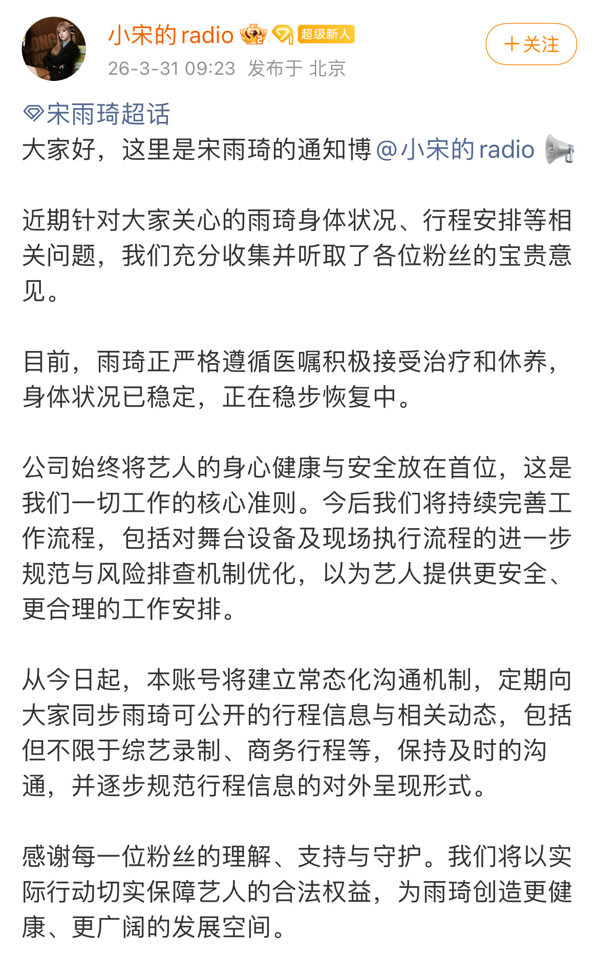 宋雨琦对接回应粉丝 宋雨琦粉丝连续几天维权,对接回应:宋雨琦正严格遵循医嘱积极接受治疗和休养,身体状况稳步恢复,会定期同步可公开的行程信息与相关动态。