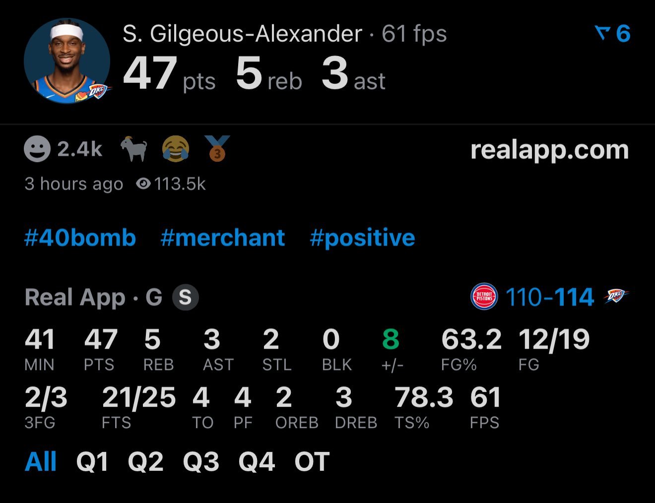 SGA砍47+5+3,带队加时击败活塞,雷霆赛季第60胜。