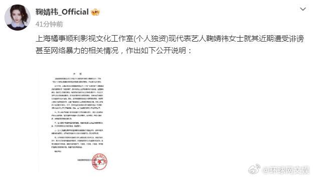 声明还提到,鞠婧祎“始终严格遵守国家法律法规,依法积极履行公民应尽的纳税等义务,并已积极配合完成相关抽查、检查程序”。
