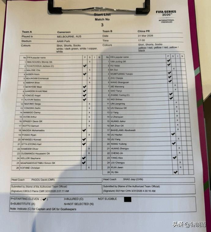国足对喀麦隆友谊赛首发阵容公布! 国足03月31日下午14:00,将与世界劲旅喀麦隆在澳大利亚进行一场友谊赛,赛前国足公布了首发阵容: 前锋: 张玉宁 韦世豪 中场:王玉栋 徐彬 王上源 后卫:胡荷韬 吾米提江 朱辰杰 刘浩帆 杨希 守门员:颜骏凌 本场比赛邵佳一采取的是防守阵容,阵型是541或者532,也可能是352。 这个阵容比较灵活,进攻就是352,防守就是541或532,韦世豪可以打前锋或者前腰,张玉宁单箭头中锋。 吾米提江和刘浩帆以及朱辰杰打三中卫,不过这个后卫组合身高偏矮。 喀麦隆可以说是世界劲旅,世界前16名的水平,国足与喀麦隆实力差距有些偏大,能守平就非常好了,或者就是小负当赢。 您觉得国足会打平喀麦隆吗?