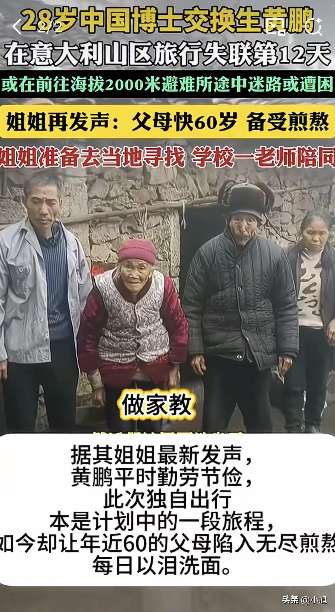 当地时间3月30日,意大利多洛米蒂山区,几个德国和奥地利游客在富内斯谷的雪里发现了一具遗体。当时那片区域刚经历过雪崩,厚厚的积雪下面埋着什么,谁也没想到。 直到晚上官方确认,遗体上的衣物和装备跟失踪时完全一致,身上还带着护照。他就是两个多月前在那片山区消失的中国博士生黄鹏,28岁。 两个多月的煎熬等待,终于有了答案,但这答案太沉重了。 从1月19日早上六点半离开住处算起,黄鹏的家人已经等了太久。他那天从维泰博市出发,坐火车去多洛米蒂,本打算23号就回来。出门前他跟姐姐说要去采论文素材,还说那边安全。谁能想到这一去,再也没能回来。 黄鹏来自贵州兴义农村,父母都快六十岁了,常年靠在工地打零工维持生计。家里还有九十多岁的爷爷奶奶要照顾,一家人省吃俭用,就为了供这个孩子读书。 从本科到博士,黄鹏一直靠着助学贷款和勤工俭学撑过来的。他省到什么程度?一套床上四件套用了整整七年,衣柜里只有三件衣服,一件穿了四年多。在学校食堂吃饭,一顿从不超过十块钱。到了意大利,室友拍来的照片里,柜子里还是那三件衣服。 朋友米粒说,平时黄鹏要么在家,要么就在导师的工作室,大部分时间都用在学术上,没什么不良嗜好,就是一个很爱学习的男孩。他也没谈过女朋友,打交道的只有学长学妹,交际圈特别简单。 这样的寒门孩子,一步步读到了博士,拿到国家公派留学奖学金,去了意大利图西亚大学。研究方向是“技术促进可持续性和生物技术”,听起来很高深,但他真的很拼。学业成绩优异,拿了多项奖学金,还发表了好几篇高质量论文。 本来今年,他就要博士毕业了。 姐姐说,弟弟出国那天,还特意叮嘱九十多岁的爷爷奶奶保重身体,承诺等他回国工作后,每个月都给爷爷奶奶拿生活费。最后一次通话时,姐姐还跟他说,等你毕业了一定要带爸爸妈妈出去看看,带他们坐坐飞机,见见外面的高楼大厦。 这些话,现在听起来让人心里堵得慌。 1月21日,民宿女老板最后一次看见黄鹏出门,之后就再也没回来。手机关机,微信也不回。朋友查了他电脑的浏览记录,发现他之前搜索过通往“佛罗伦萨避难所”的路线。那个避难所海拔超过2000米,只能徒步到达,推测他可能是在途中迷了路,或者遇到了什么意外。 多洛米蒂山区的冬天,气温能降到零下二十度,雪崩说来就来。1月下旬那片山区正遭遇强降雪,能见度极低,救援直升机都无法起飞。当地出动了宪兵队、财政卫队和高山救援队,还用了能探测关机手机信号的设备,依然找不到人。 3月初,因为雪崩风险太高,搜救行动被迫暂停。直到3月30日,积雪融化了一些,徒步的游客才发现了他的遗体。 被雪崩掩埋了两个多月。 黄鹏失联的消息传回国内时,他姐姐说,全家都快扛不住了。父母得知消息后每天睡不着觉、吃不下饭,就坐在家门口等,眼睛都哭肿了。爷爷奶奶九十多岁了,还卧病在床,家里一直瞒着,不敢告诉他们。 而家人想去意大利找,却连路费都凑不出来。姐姐说根本不敢算赴意的费用,那笔钱完全不是农村家庭能承担得起的。而且正值冬奥会期间,当地住宿一房难求。最后是靠黄鹏在法国工作的表弟请假赶过去帮忙的。 一个靠搬砖供出来的博士,眼看就要毕业了,眼看就要改变一家人的命运了。 结果人没了。 这就是一个普通农村家庭全部的希望破灭的故事。一句“可惜”,根本压不住这背后的沉重。 你觉得,像黄鹏这样的寒门孩子,走到这一步到底有多难? 来源:红星新闻、极目新闻、南方网、封面新闻等
