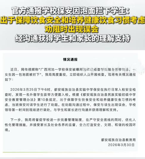 这个学校有小卖部吗?这个东西通报一下。如果没有小卖店,那我相信绝对是误会。如果有小卖部,那么就是狗吃草有驴心思,大家都懂的,这样新闻又不是一个了。 3月30日,广西河池都安瑶族自治县教育局发布情况通报:近日,网传视频称“广西河池一学校保安被曝用测试仪检查学生随身携带物品,一女生因一包泡面被拦下”,我局高度重视,立即组织人员开展核查。现将有关情况通报如下:2026年3月25日下午6时,都安瑶族自治县实验中学保安在执行日常入校安全检查时,发现一名外宿学生欲带方便面入校。根据《都安瑶族自治县民族实验初级中学安全教育管理办法》第10条规定,出于保障学生饮食安全和培养健康饮食习惯的考虑,当班保安对该学生进行了劝阻。在劝阻沟通过程中,保安与该生出现误会,学校领导第一时间到现场进行调处,与学生和家长进行沟通并获得理解和支持。下一步,我局将督促学校进一步完善管理制度,在严守安全底线的同时,优化人性化管理措施,并接受家长及社会各界的监督,全力打造安全、文明、和谐的校园环境。