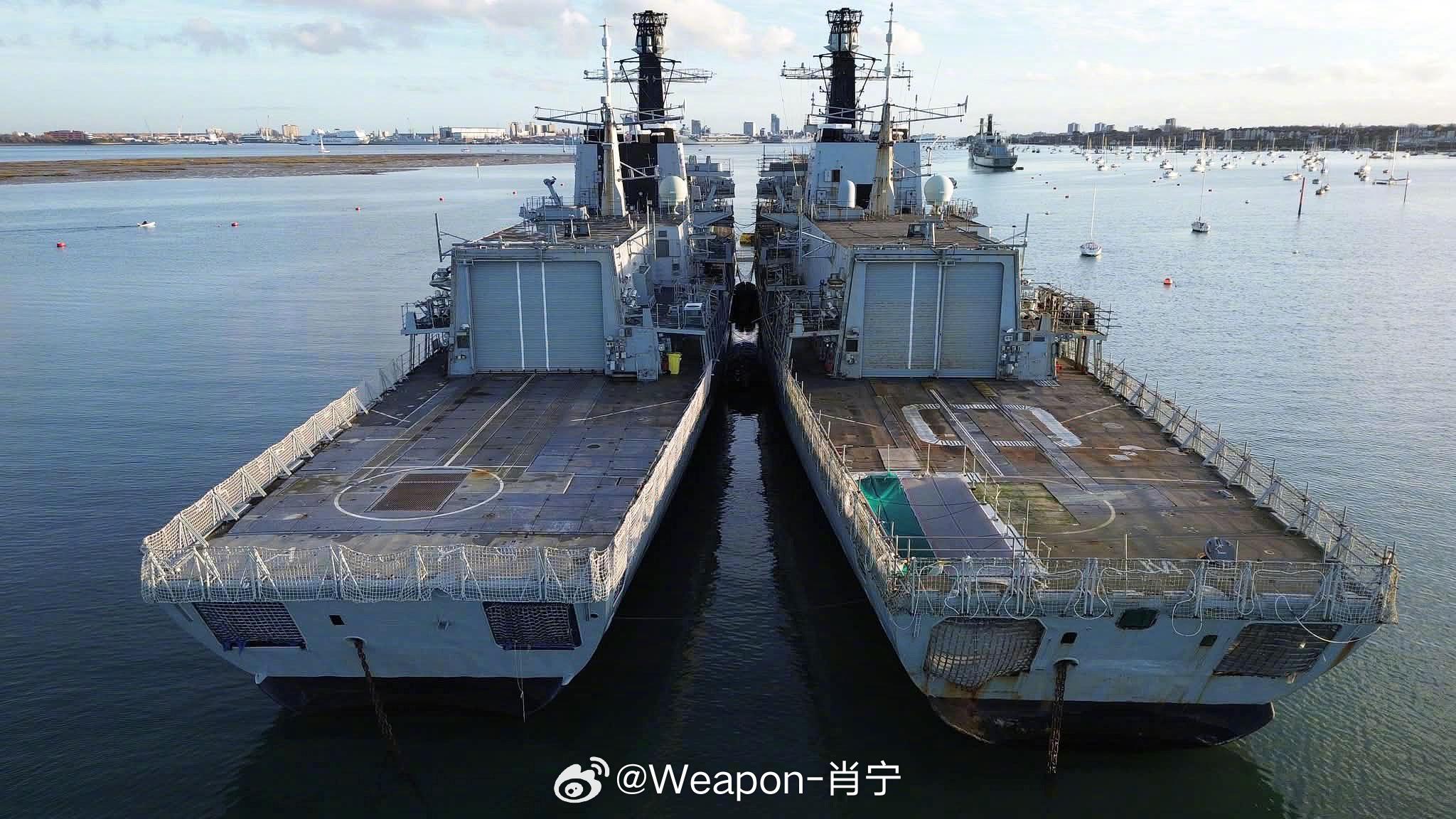 烽火问鼎计划每天认识一件兵器 英国皇家海军23型(公爵级)反潜护卫舰“阿盖尔”号(F231)和“威斯敏斯特”号(F237)并排停泊在法勒姆河口,等待被拖往土耳其拆解。“威斯敏斯特”号的飞行甲板已被切割,以便拆除拖曳阵列声呐绞车。