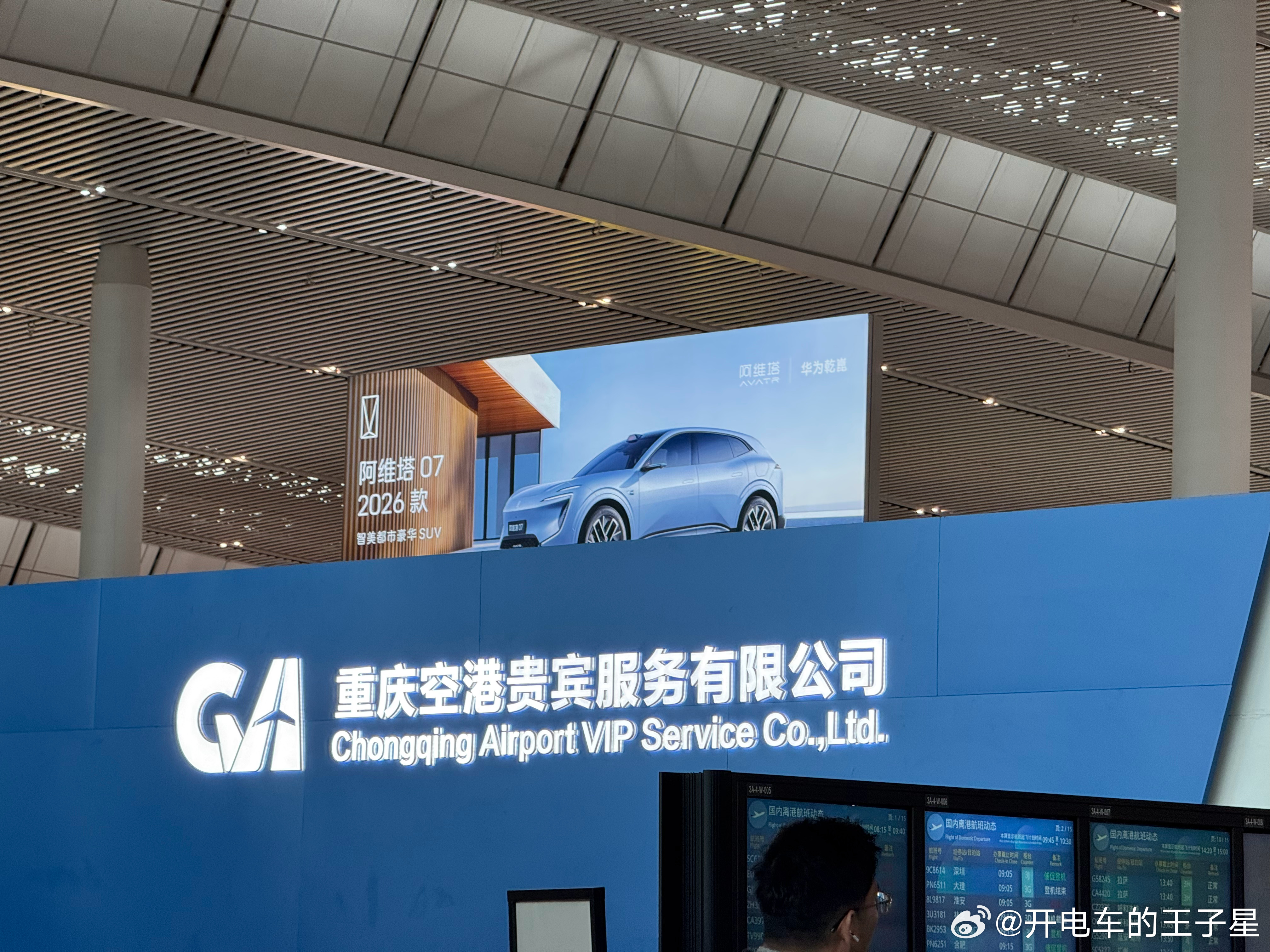 我和汽车的日常大v聊车 阿维塔12 重庆机场阿维塔霸屏了国内出发无论哪个口进去满屏的阿维塔别人是滚动播出 阿维塔直接好像买断的时常屏幕动也不动