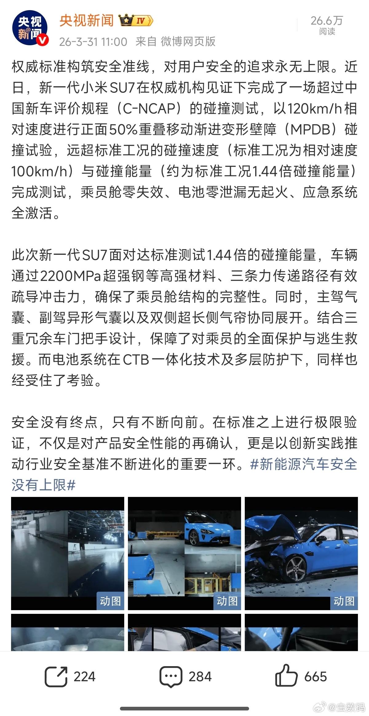 新能源汽车安全没有上限 央视报道了行业标杆级的新SU7的碰撞测试,可以说新SU7把安全标准做到了极限。