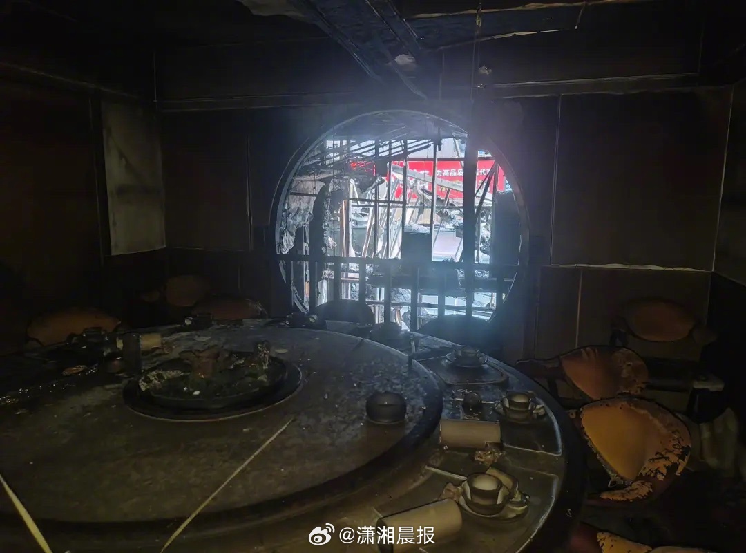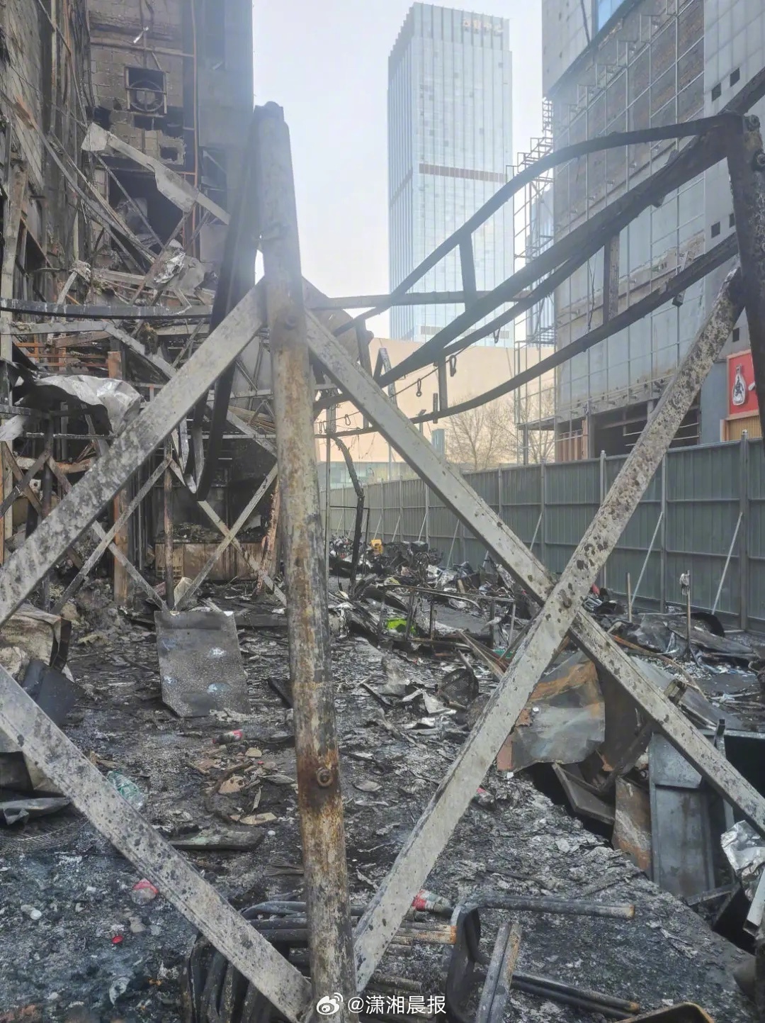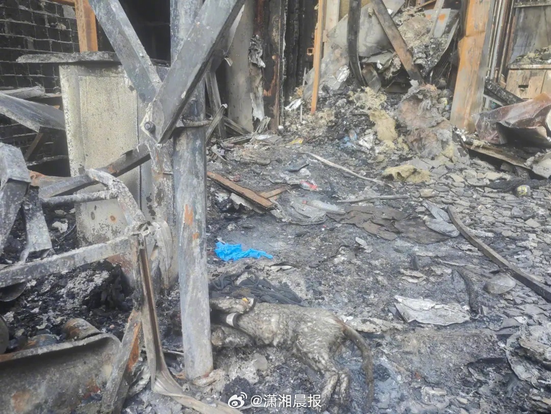 3月31日,潇湘晨报·晨视频记者进入事发现场内部。记者看到,在店铺前停着一排电动车,也被烧毁得只剩下支架,在一家店铺门口,一只未能逃出的小狗还倒在地上。