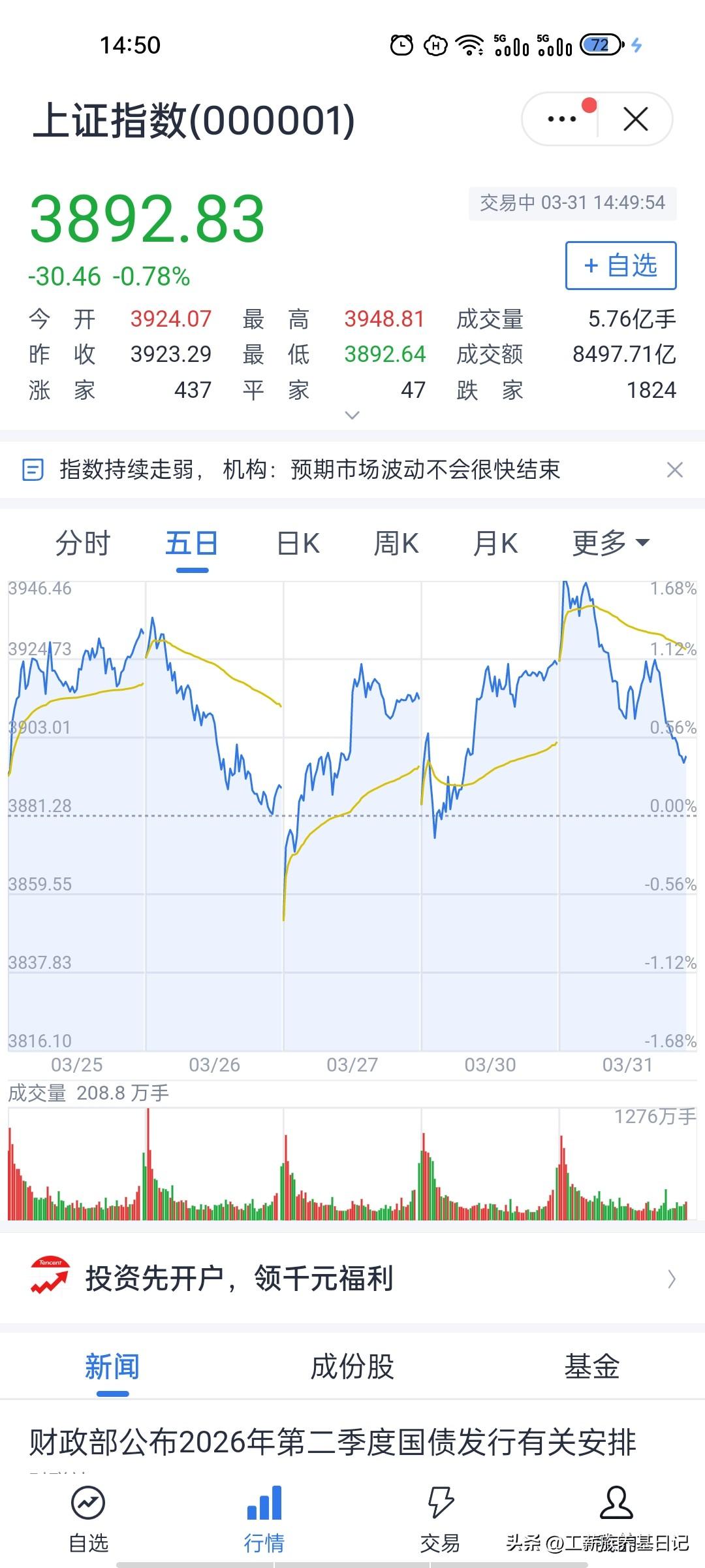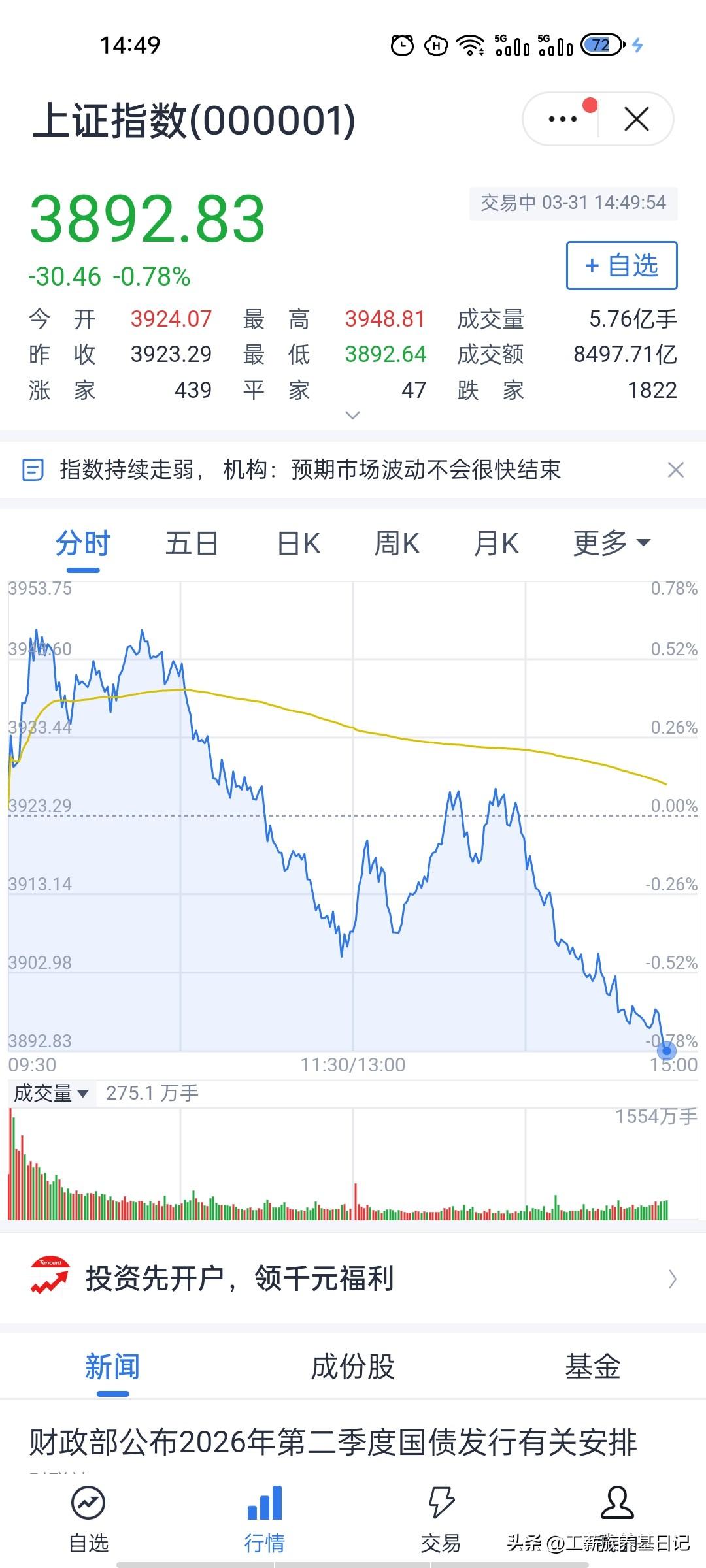 高位放量杀跌!短期调整开启,目标支撑或许是3820-3850! 我直接一针见血跟大家说,不废话也不忽悠,今天3月31日的上证指数,说白了就是高位回调加上放量杀跌,再叠加情绪踩踏,走出了一波标准的短期调整。从盘面走势来看,分时上早盘冲高回落,午后更是单边下杀,尾盘连一波像样的反弹都没有,走势明显偏弱;再看五日走势,指数冲高后连续走弱,今天直接回吐了此前大部分涨幅;而日K线上,指数已经跌破12日EMA和50日EMA,趋势正式转弱,不过好在还没到中期破位的地步。 在我看来,这波大跌主要有三个核心原因,首先就是高位获利了结,指数从3794一路涨到4197,涨幅接近10%,本身就有调整需求,资金在3950附近开始集中兑现,直接形成了集体砸盘的局面。其次是量能虽然维持高位,但市场分歧明显加大,成交额保持在8500亿以上说明资金在不断换手,可上涨没动力、下跌却放量,很明显资金在持续往外流出。最后就是市场预期发生变化,机构观点也偏向谨慎,这也是当下市场最真实的情绪写照,不过大家也不用慌,这并不是崩盘也不是危机,只是正常的技术性回调而已。 我认为这波调整的合理区间就在3820—3850,从4197回调到黄金分割0.382位置大概就在3820附近,这也是强势回调的常见位置,再加上前期平台支撑在3830—3860一带,下方承接力度是比较足的。今日低点已经到3892,距离这个支撑区间越来越近,即便继续下探,空间也十分有限,而且最极限的情况也很难跌破3800,毕竟这里是关键的趋势中枢。 你们觉得呢?以上纯属个人愚见,欢迎探讨。