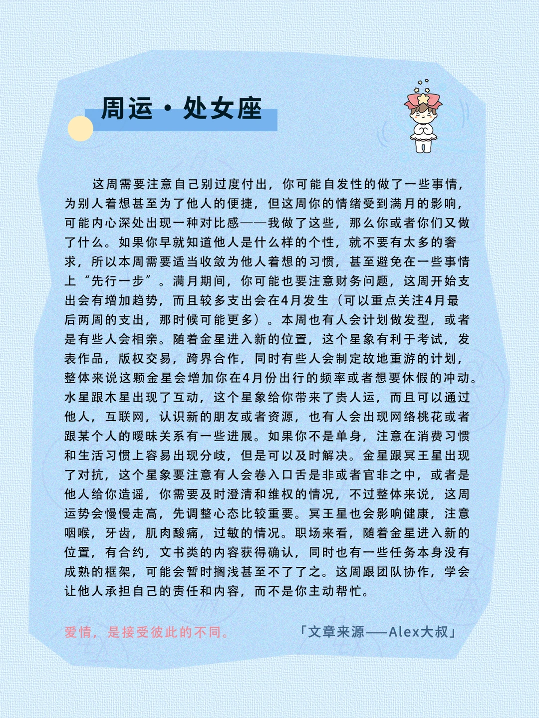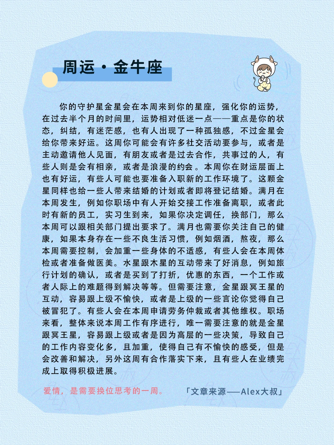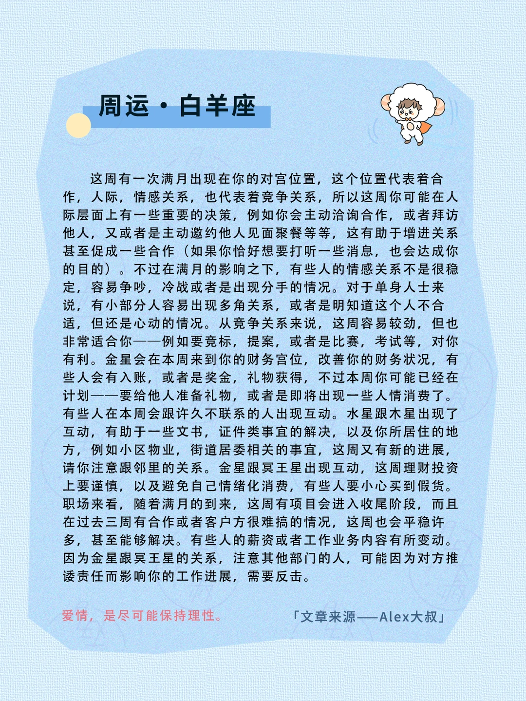 本周重要星象 上:(下篇请阅读另一篇周运) 这周金星将来到自己的守护星座,强化了金星的能量,同时还有一次满月出现,此次满月发生在掌管人际、合作、情感、竞争关系的位置——而这个满月发生的位置,核心代表着一对一的关系。因此,综合这两个星象,本周我们需要注意这些事情: 金星回到自己的守护星座,能量被强化,而且所在的位置也会让我们更加:认可自己,肯定自己的价值,同时也会再次巩固我们的价值观念,跟满月出现的能量交互表现为:道不同不相为谋,但是如果你跟我想得一样,价值观一致,就可以巩固关系或者深化关系。在本周这两个星象影响下,就会出现一些积极的结果,例如——原来你跟我想得一致,那我们便是朋友,可以合作,或者是可以促成情感关系。或者发现跟对方是呈相反的思维方式和价值取向,因此——不适合继续做朋友,划清界限,保持安全距离,情感关系上的波动,以及合作遇到阻碍甚至出现竞争关系。但是请不要过度计较——到底谁是对的,谁是错的,这里其实没有真实的对与错,而是观念和视角的区别而已。 满月也会让我们更在意公平,平衡这些问题,除了上述提及到的人际,情感,合作关系之外,工作或者生活中的问题,我们也会更加在意这类公平,平衡问题。举一个例子:面对特权,我们会觉得不公平,除非有其他条件导致这种特权发生,就像是游乐园存在快速通道的服务(但需要额外购买),如果这种额外特权存在合理化的“规定”,我们不会有太大的波澜和介意,但如果没有合理化的理由,这周出现了一些不合理,不公平的事情的话,我们就会下意识的反击,你会发现在这周对这种不公平的事情有点零容忍,甚至会维权。 金星的换座配合满月的能量,也意味着——一些规则将被重新定义,小到人与人关系,或者是公司的规定,大到国际关系(外交,外贸这类)。 金星也会强化我们的占有欲,甚至是嫉妒心,也非常容易出现假想敌,这种较劲的感觉如果可以合理利用,其实会激发我们的上进心和野心,相反——就会被控制,甚至让自己做出一些错误的决定,影响到一些原本稳定的东西,因此请你慎重看待自己和他人人性的阴暗面。