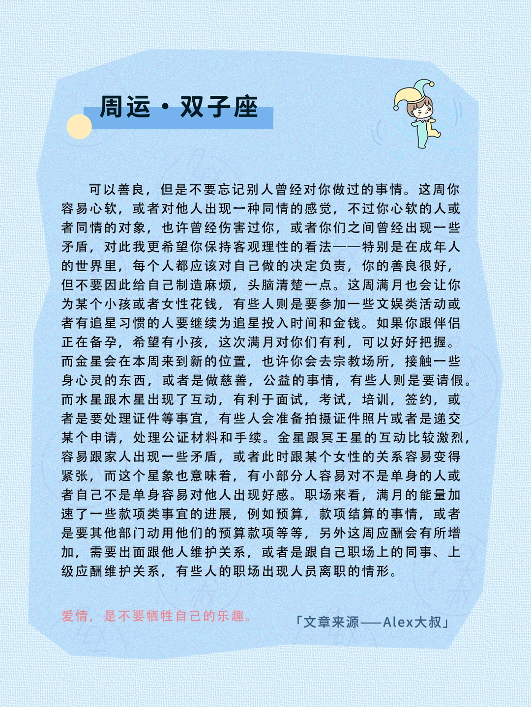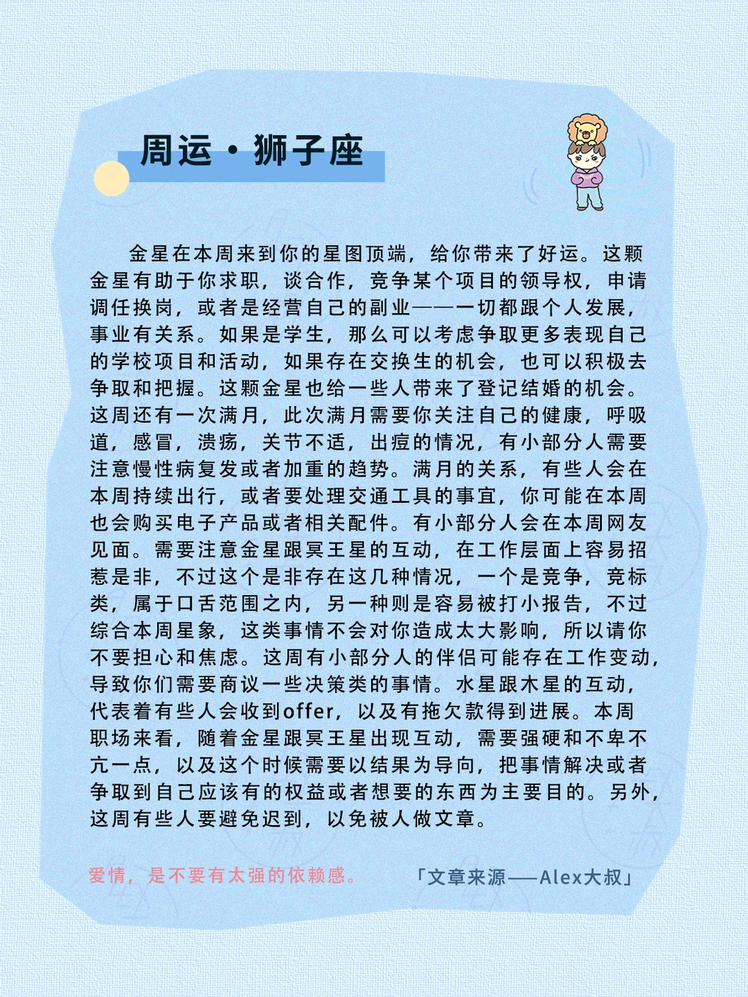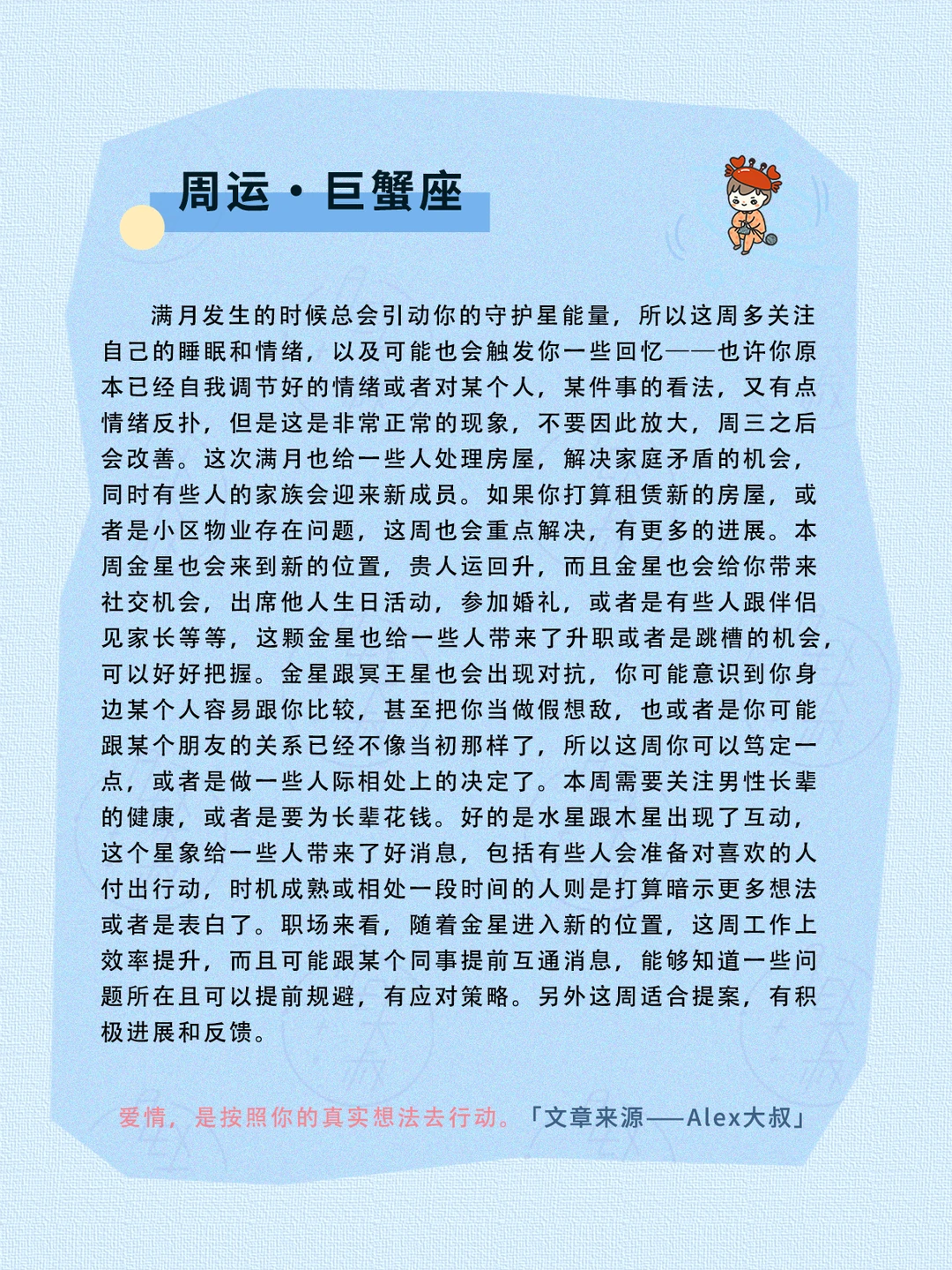 本周重要星象 上:(下篇请阅读另一篇周运) 这周金星将来到自己的守护星座,强化了金星的能量,同时还有一次满月出现,此次满月发生在掌管人际、合作、情感、竞争关系的位置——而这个满月发生的位置,核心代表着一对一的关系。因此,综合这两个星象,本周我们需要注意这些事情: 金星回到自己的守护星座,能量被强化,而且所在的位置也会让我们更加:认可自己,肯定自己的价值,同时也会再次巩固我们的价值观念,跟满月出现的能量交互表现为:道不同不相为谋,但是如果你跟我想得一样,价值观一致,就可以巩固关系或者深化关系。在本周这两个星象影响下,就会出现一些积极的结果,例如——原来你跟我想得一致,那我们便是朋友,可以合作,或者是可以促成情感关系。或者发现跟对方是呈相反的思维方式和价值取向,因此——不适合继续做朋友,划清界限,保持安全距离,情感关系上的波动,以及合作遇到阻碍甚至出现竞争关系。但是请不要过度计较——到底谁是对的,谁是错的,这里其实没有真实的对与错,而是观念和视角的区别而已。 满月也会让我们更在意公平,平衡这些问题,除了上述提及到的人际,情感,合作关系之外,工作或者生活中的问题,我们也会更加在意这类公平,平衡问题。举一个例子:面对特权,我们会觉得不公平,除非有其他条件导致这种特权发生,就像是游乐园存在快速通道的服务(但需要额外购买),如果这种额外特权存在合理化的“规定”,我们不会有太大的波澜和介意,但如果没有合理化的理由,这周出现了一些不合理,不公平的事情的话,我们就会下意识的反击,你会发现在这周对这种不公平的事情有点零容忍,甚至会维权。 金星的换座配合满月的能量,也意味着——一些规则将被重新定义,小到人与人关系,或者是公司的规定,大到国际关系(外交,外贸这类)。 金星也会强化我们的占有欲,甚至是嫉妒心,也非常容易出现假想敌,这种较劲的感觉如果可以合理利用,其实会激发我们的上进心和野心,相反——就会被控制,甚至让自己做出一些错误的决定,影响到一些原本稳定的东西,因此请你慎重看待自己和他人人性的阴暗面。