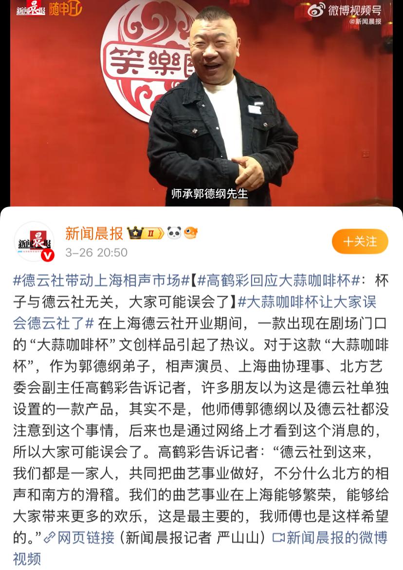 【上海曲协理事高鹤彩回应大蒜咖啡杯,内幕让人唏嘘不已,你怎么看?】 近日,郭德纲鹤字科弟子、知名相声演员、上海曲协理事、北方艺委会副主任高鹤彩在接受媒体采访的时候,回应了上海德云社关于打算咖啡杯的事情,高鹤彩直言:许多朋友以为这是德云社单独设置的一款产品,其实不是,他师傅郭德纲以及德云社都没注意到这个事情,后来也是通过网络上才看到这个消息的,所以大家可能误会了。由此可见,这个大蒜咖啡杯是和德云社没有关系,只是被一部分人作为噱头而已。根据相关信息也是能够看到这个杯子是本地的一个文创产品,主要是基于砸挂本地文化为出发点的,更多的是希望通过这样的方式融入海派文化的。 德云社落户上海之后,更多的话题是曲艺文化和海派文化之间的冲突,更多的上升到当年郭德纲和周立波之间的争端,甚至上升到地域文化之间的关系。其实,这些话题更多的是把两种文化意识搞成对立面了,本应该是相互融合相互促进的两种文化态势,如今受到舆论的影响反而形成这样的争论。 郭德纲在上海德云社开业之时也是表达了希望曲艺能够在上海落地生根,不断成长,高鹤彩在接受采访的时候也是表达了希望曲艺事业在上海能够繁荣,能够给大家带来更多的欢乐,这是最主要的。因此,大蒜咖啡杯的内幕更多的是一种文化融合和文化意识形态落地的过程,也是大众乐见其成的文化发展态势!