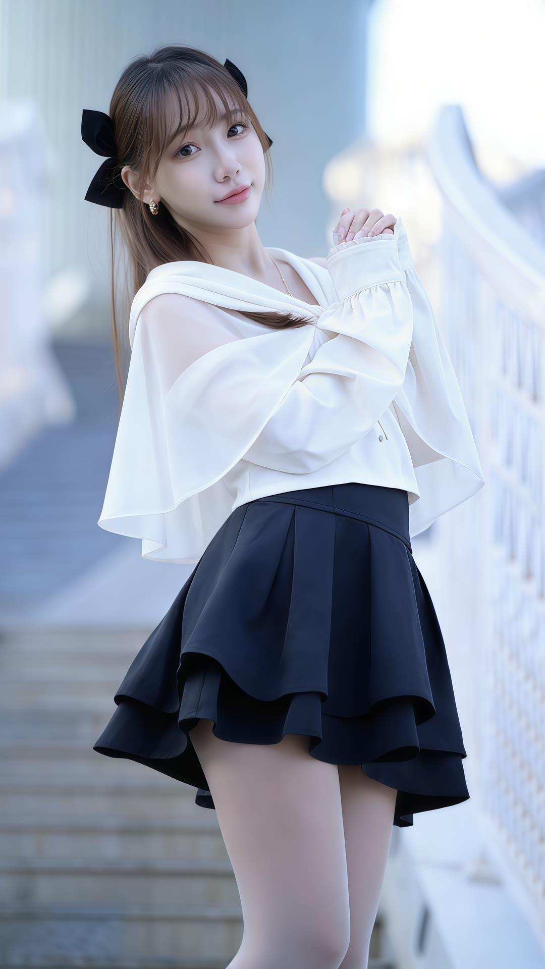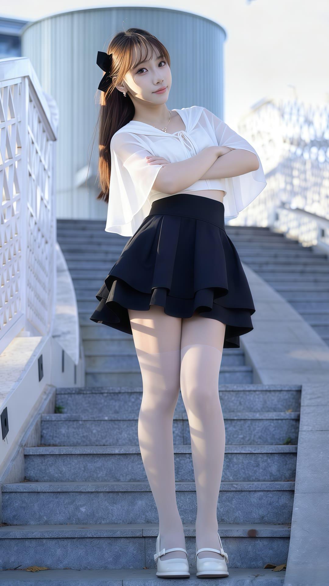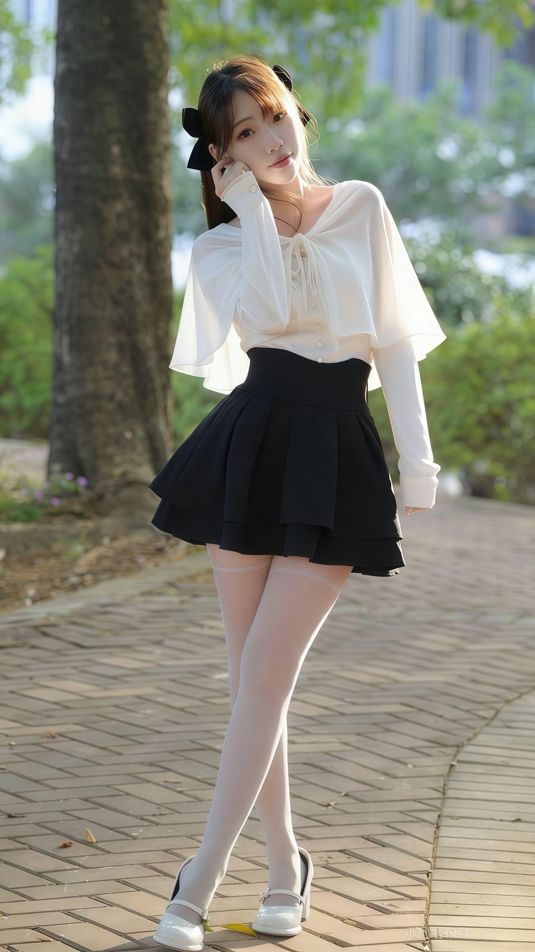 夏日清新少女风,白色上衣搭配黑色短裙,甜美可爱,阳光下的你最美!🌞💕