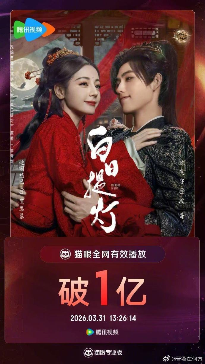 【白日提灯开播4天播放破亿】白日提灯破亿速度有点快 3月31日,据猫眼专业版数据,领衔主演剧集《白日提灯》开播第四天,全网有效播放量破亿。另据欢网大数据显示,《白日提灯》获得2026第13周在播剧舆情热度周榜第一。迪丽热巴陈飞宇