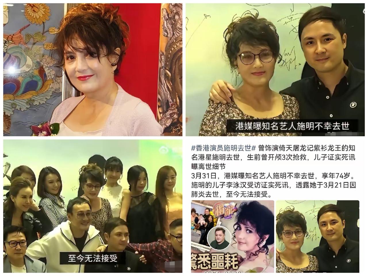 这是今天娱乐圈最让人鼻酸的消息!3月最后一天,平静的娱乐圈突然传来噩耗,74岁“鬼后”施明因病离世,消息一出,很多老港剧观众都破防了。 儿子李泳汉在采访中泣不成声,坦言母亲3月21日就因肺炎离开了,只是家人实在难以接受,才迟迟没有对外公布。荧幕上的施明又飒又亮眼,演过紫衫龙王,主持过《怪谈》,还曾为史泰龙护驾,是一代人心中的经典港星。 可谁能想到,晚年的她被病痛反复折磨,多次开颅、长期住院,身体早已撑到极限。这一次本是小毛病入院,却突发意外,再也没能走出病房。 人前有多风光,人后就有多辛苦。施明这一辈子,事业精彩,人生却满是坎坷,亲情有遗憾,健康有磨难,看得人格外心疼。一代传奇悄然落幕,只愿她从此远离病痛,安稳长眠。 对于施明的一生,你有什么想说的?一起来聊聊吧。