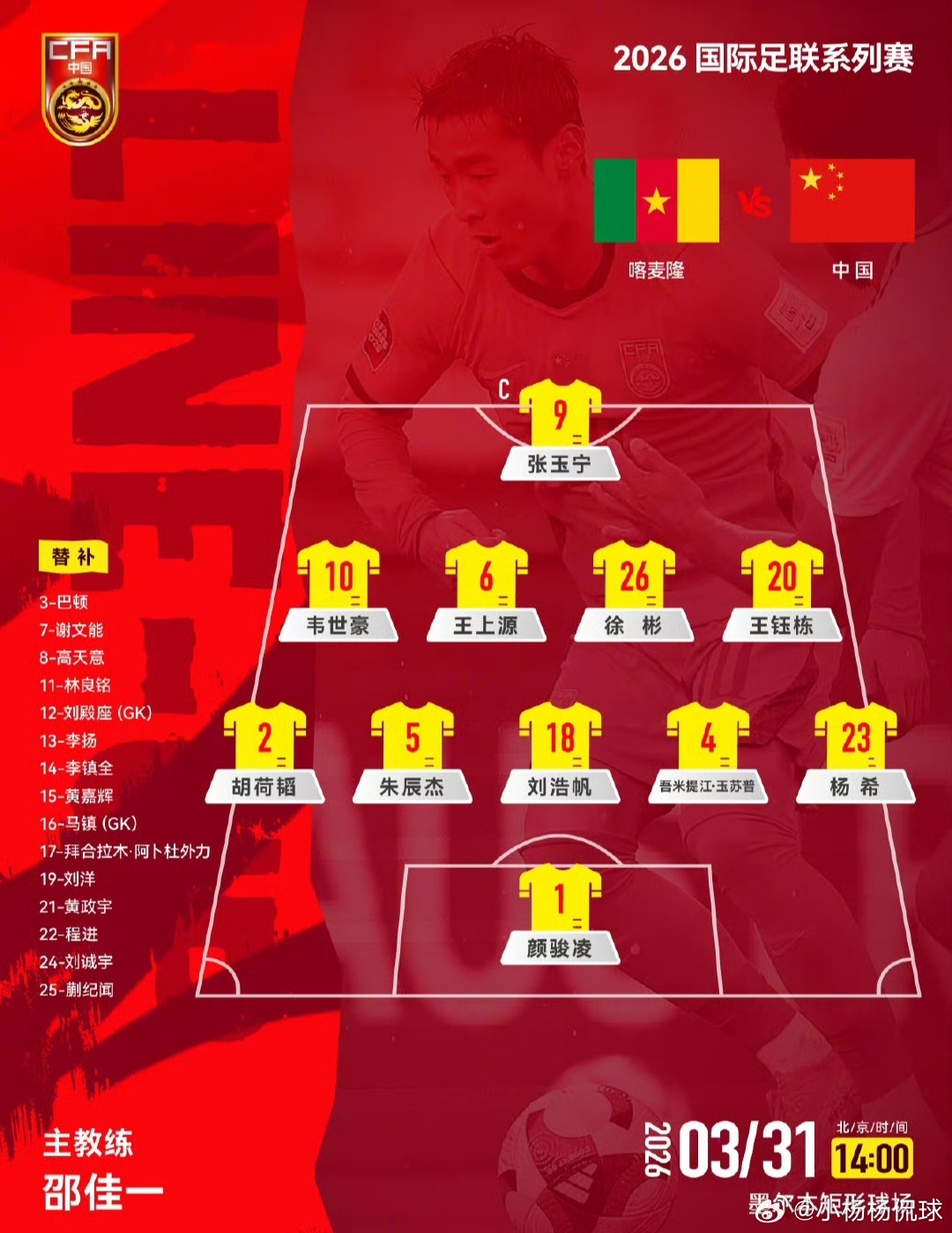 国足vs喀麦隆国足首发派出6名U23球员,平均年龄仍比喀麦隆大3.3岁FIFA系列赛澳大利亚站第二轮,国足对阵喀麦隆。赛前,两队首发阵容正式公布。国足本场安排6名U23球员先发,分别是王钰栋、徐彬、胡荷韬、刘浩帆、吾米提江、杨希,首发平均年龄25.2岁。喀麦隆首发平均年龄仅21.9岁,7号蒙耶贝与9号永多均为19岁,此役11人均在上一场对阵澳大利亚时出任替补。
