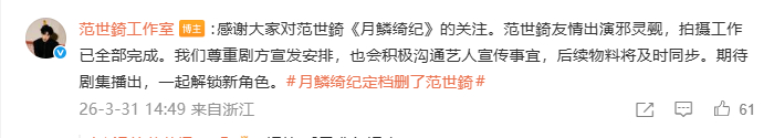 范世錡方称尊重剧方宣发安排 范世錡方称尊重剧方宣发安排,也会积极沟通艺人宣传事宜,后续物料将及时同步。