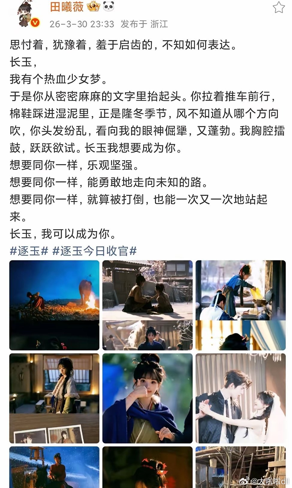 终于等到田曦薇的收官文。其实大家都知道CP是假的,大大方方的放个合照算是给CP粉剧粉一个圆满。这也没什么也不会影响彼此的下部戏的!感觉虽然一直磕她俩,逐玉结束了感觉一切都结束,都是假的。田曦薇永远爱她的剧和角色,永远体面,永远抱以最大的真诚去对待别人,不只有和男主的,还有和妹妹,大娘,满地,杀猪小队的都有,她从来都是这么勇敢。