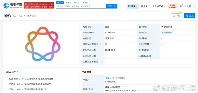 爱企查知识产权信息显示,2024年,苹果公司已在中国申请注册多枚苹果智能相关图形商标,国际分类涉及网站服务、教育娱乐、科学仪器等,当前多枚商标已被驳回复审,部分商标状态为初审公告。