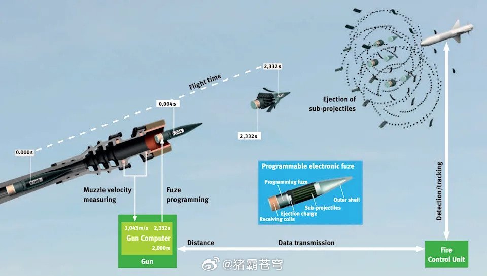 AGM-65“小牛”导弹被AHEAD空爆弹药击中后的照片。这些导弹曾被用作莱茵金属公司30毫米和35毫米防空炮弹试验的靶弹。AHEAD原理是在每发炮弹中使用可编程定时引信,使其子弹药在目标前方略微弹道处抛射。每发炮弹的飞行时间编程是在炮口处通过感应方式完成的,使用的弹道数据来自火控系统。军事Ai新视野烽火问鼎计划每天认识一件兵器