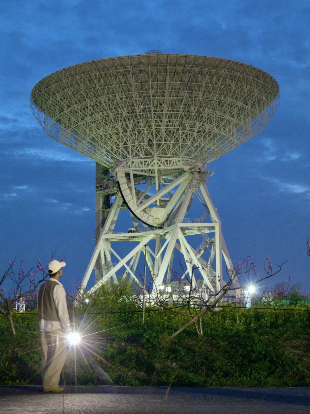 巨大的天马射电望远镜,被称为魔都版的“红岸基地”,晚饭后来打卡更魔幻。望远镜下的桃花也已经含苞待放,清明假期预计盛花期。