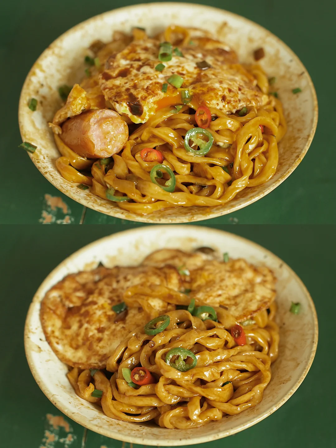 朴素美味的葱油鲜椒荷包蛋拌面。