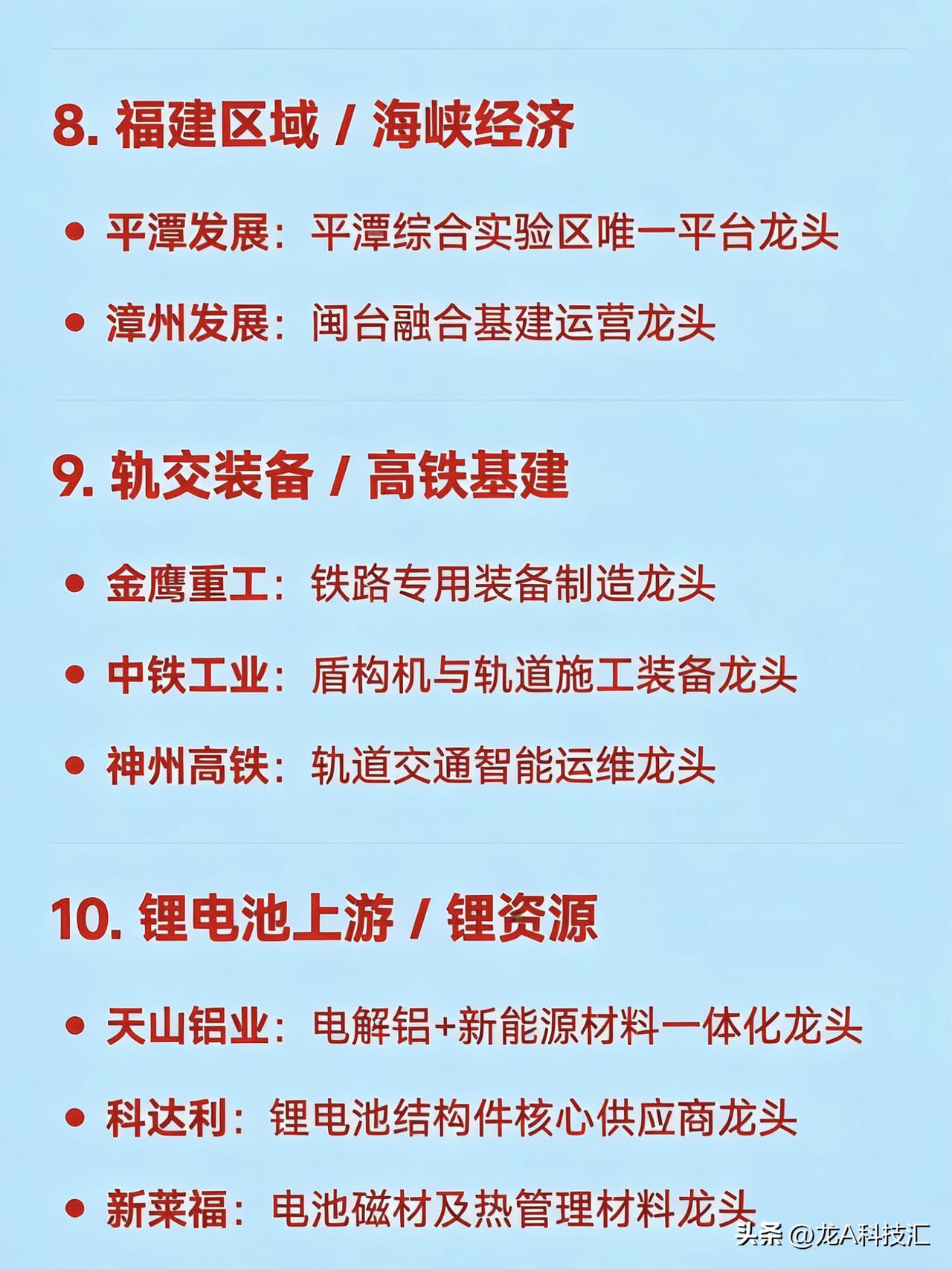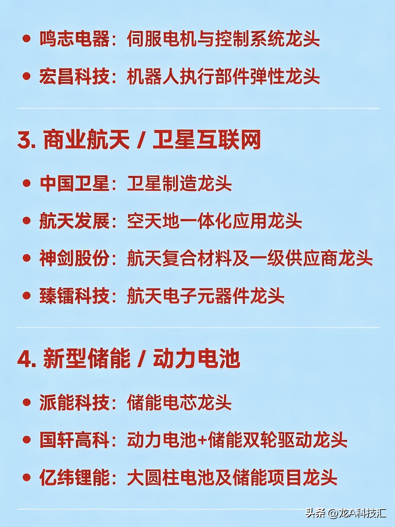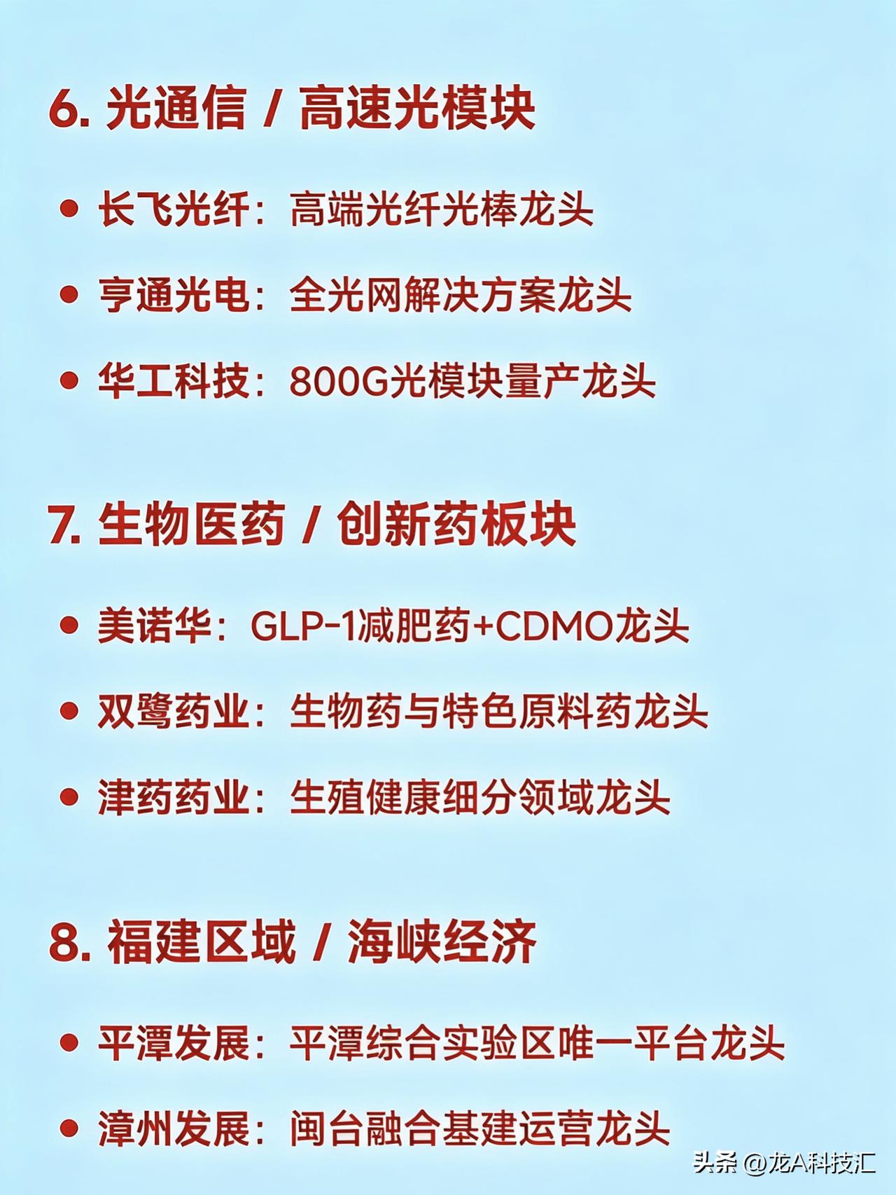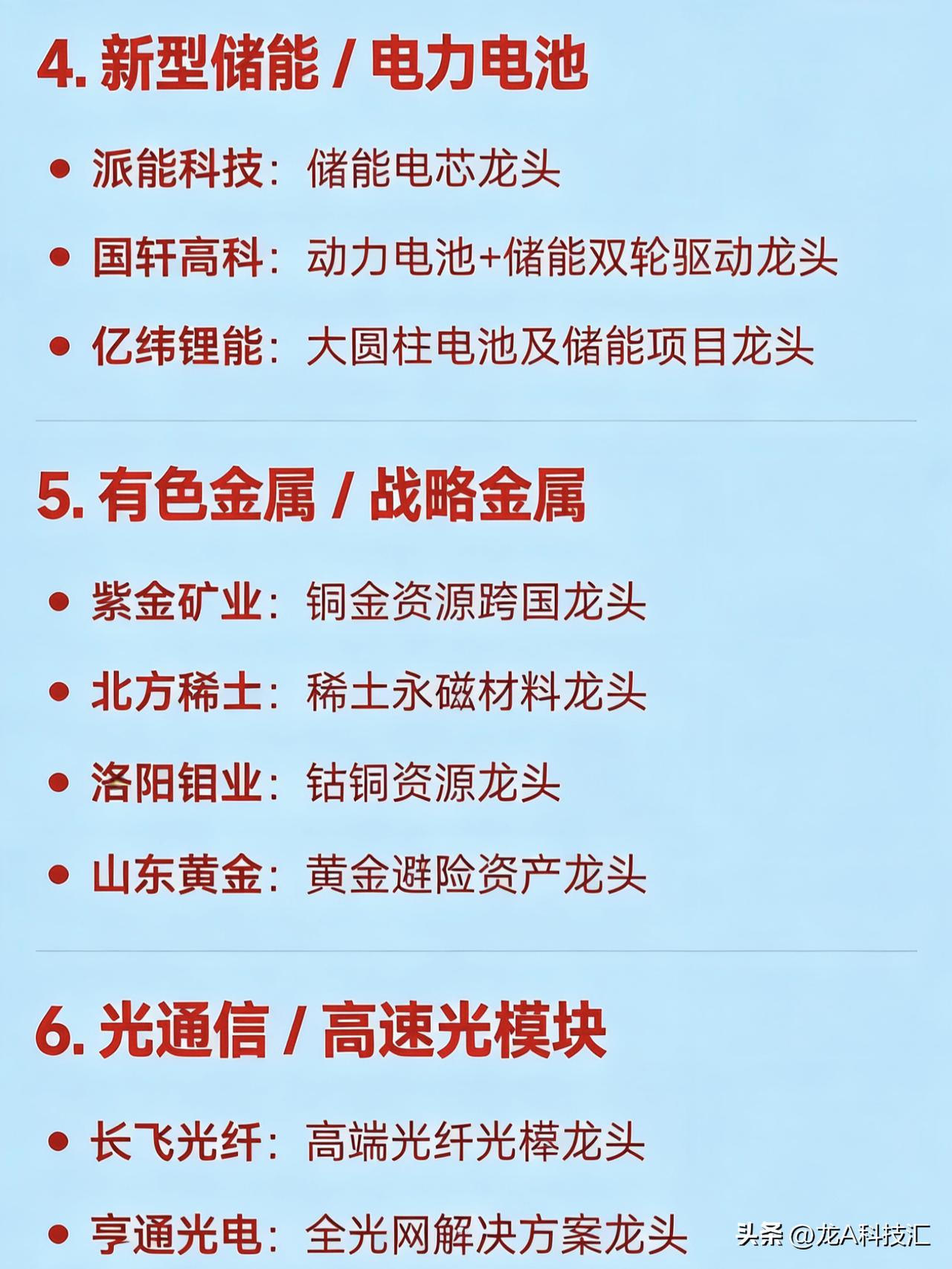 2026年3月31日十大热点科技及其产业链核心龙头 1. AI算力产业链 海光信息:国产AI芯片龙头 中际旭创:光模块龙头 拓维信息:算力服务器龙头 华工科技:光模块+激光设备双主业龙头 2. 人形机器人 / 精密传动 绿的谐波:精密减速器龙头 三花智控:热管理系统龙头 鸣志电器:伺服电机与控制系统龙头 宏昌科技:机器人执行部件弹性龙头 3. 商业航天 / 卫星互联网 中国卫星:卫星制造龙头 航天发展:空天地一体化应用龙头 神剑股份:航天复合材料及一级供应商龙头 臻镭科技:航天电子元器件龙头 4. 新型储能 / 动力电池 派能科技:储能电芯龙头 国轩高科:动力电池+储能双轮驱动龙头 亿纬锂能:大圆柱电池及储能项目龙头 5. 有色金属 / 战略金属 紫金矿业:铜金资源跨国龙头 北方稀土:稀土永磁材料龙头 洛阳钼业:钴铜资源龙头 山东黄金:黄金避险资产龙头 6. 光通信 / 高速光模块 长飞光纤:高端光纤光棒龙头 亨通光电:全光网解决方案龙头 华工科技:800G光模块量产龙头 7. 生物医药 / 创新药 美诺华:GLP-1减肥药+CDMO龙头 双鹭药业:生物药与特色原料药龙头 津药药业:生殖健康细分领域龙头 8. 福建区域 / 海峡经济 平潭发展:平潭综合实验区唯一平台龙头 漳州发展:闽台融合基建运营龙头 9. 轨交装备 / 高铁基建 金鹰重工:铁路专用装备制造龙头 中铁工业:盾构机与轨道施工装备龙头 神州高铁:轨道交通智能运维龙头 10. 锂电池上游 / 锂资源 天山铝业:电解铝+新能源材料一体化龙头 科达利:锂电池结构件核心供应商龙头 新莱福:电池磁材及热管理材料龙头 免责声明:发文涉及资讯图等内容来自网络公共信息。仅供参考,不构成投资建议。