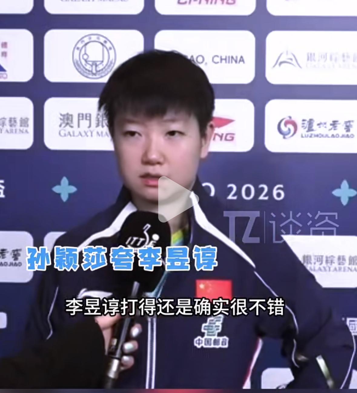 李昱谆回应夸孙颖莎的球超级霹雳转太好笑啦! 澳门世界杯小组赛首轮, 孙颖莎3:0李昱谆, 李昱谆在今天的采访中表示: “我其实超级开心的, 因为我没有跟世界第一孙颖莎打过, 抽到孙颖莎后, 感觉耶,太棒啦, 就想和世界第一交手感受一下, 谢谢世界第一的夸奖, 孙颖莎的球真的很转, 我就是很轻松的和教练聊天, 说她的球太转, 教练说她是世界第一, 你打不赢她, 好多人都打不赢她, 保持状态,好好发挥自己!” 李昱谆听到莎莎也在夸自己, 还是非常开心。 来自世界第一的夸赞, 很值得骄傲自豪!