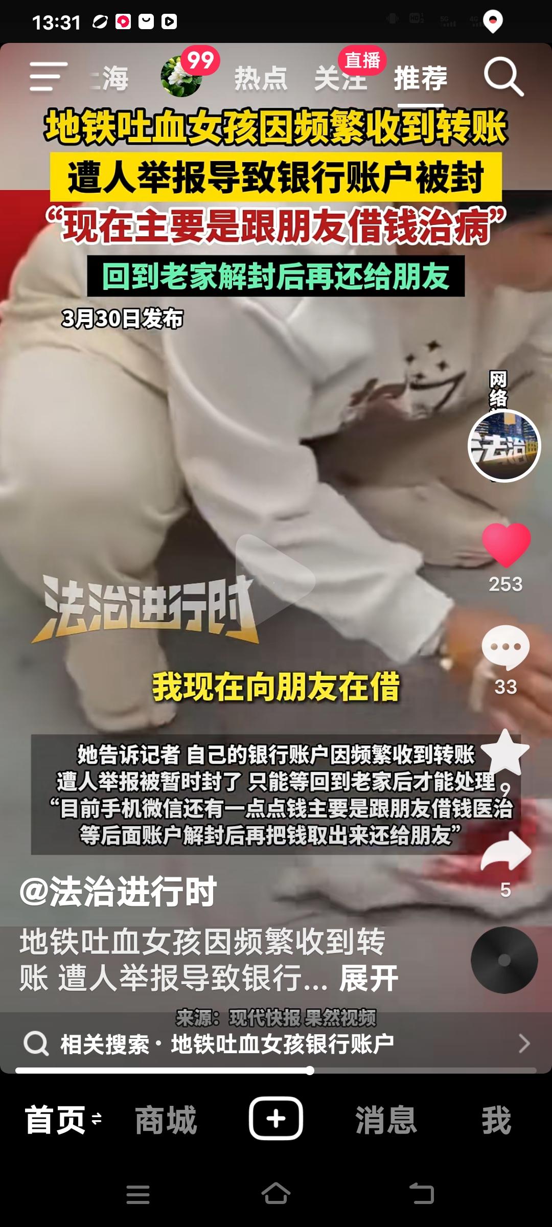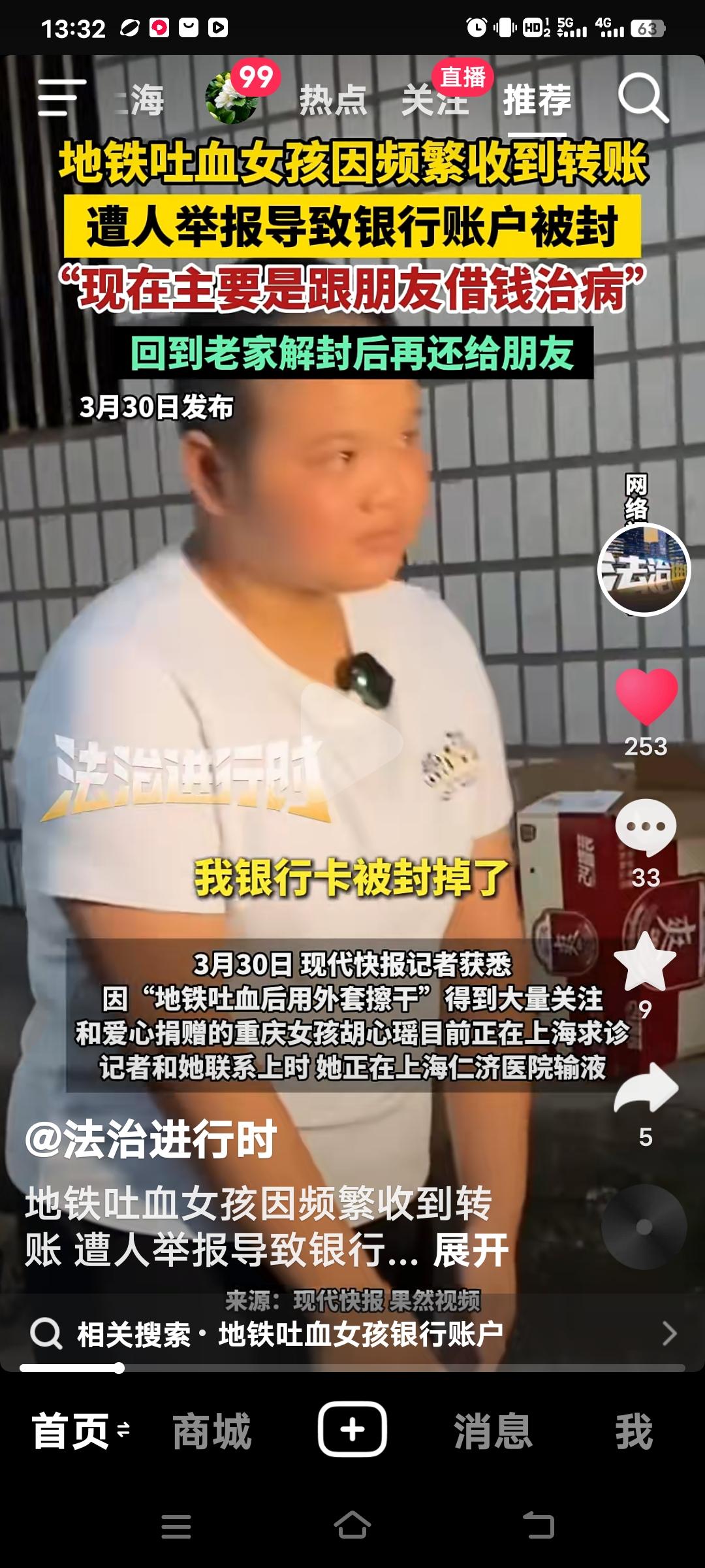 3月23日,重庆女孩胡心瑶在地铁咳血,用外套擦拭的视频走红网络。这时大家才了解到,她与罕见的ANCA血管炎已抗争了8年。善款与爱心如潮水般向她涌来,然而意外也接踵而至。短时间内,她被举报频繁接收转账,随后银行账户被封。 如今,她正在上海仁济医院输液,微信里所剩资金寥寥,只能向朋友借钱治病,打算等回老家解封账户后再还钱。她的身体状况比以往有所好转,结束上海的治疗后,她计划前往南京咨询换肾事宜。希望胡心瑶能顺利解决账户问题,早日康复。 有网友质疑:“谁这么缺德?”确实,这实在不应该,她患病是不争的事实。偌大的中国,难道就不能帮这个女孩治病吗?反而去针对她,这种事也做得出来!