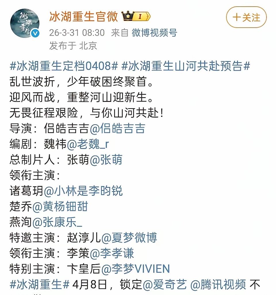 《冰湖重生》官宣定档4月8日,眼下,这部剧能打的牌只有两张,要么主攻李昀锐,所有宣发围绕他展开,要么蹭《楚乔传》热度,靠着黑红也是红博一下出圈。黄杨钿甜即便是女主,估计也不可能大张旗鼓作为宣发对象,耳环事件仍旧会带来负面影响。至于其他演员,人气流量跟不上,只能等着看故事和角色能不能抬一下他们。《冰湖重生》和《楚乔传》到底是什么关系?它俩就是续集关系,哪怕男主改名诸葛玥,但故事衔接的是宇文玥坠入冰湖,楚乔跳湖相救,误以为诸葛玥已死,然后向燕洵复仇、最终与重生的诸葛玥重逢联手。很多人不愿意承认续集关系,但事实就是如此,而且,《冰湖重生》肯定会和《楚乔传》对比,赵丽颖和黄杨钿甜,李昀锐和林更新,演技大比拼,到时候热搜话题很有可能会严重跑偏。虽然《楚乔传》口碑一般,但它的热度挺高,我感觉《冰湖重生》口碑也好不到哪里去,关键是李昀锐和黄杨钿甜没啥cp感,感觉差着辈呢。