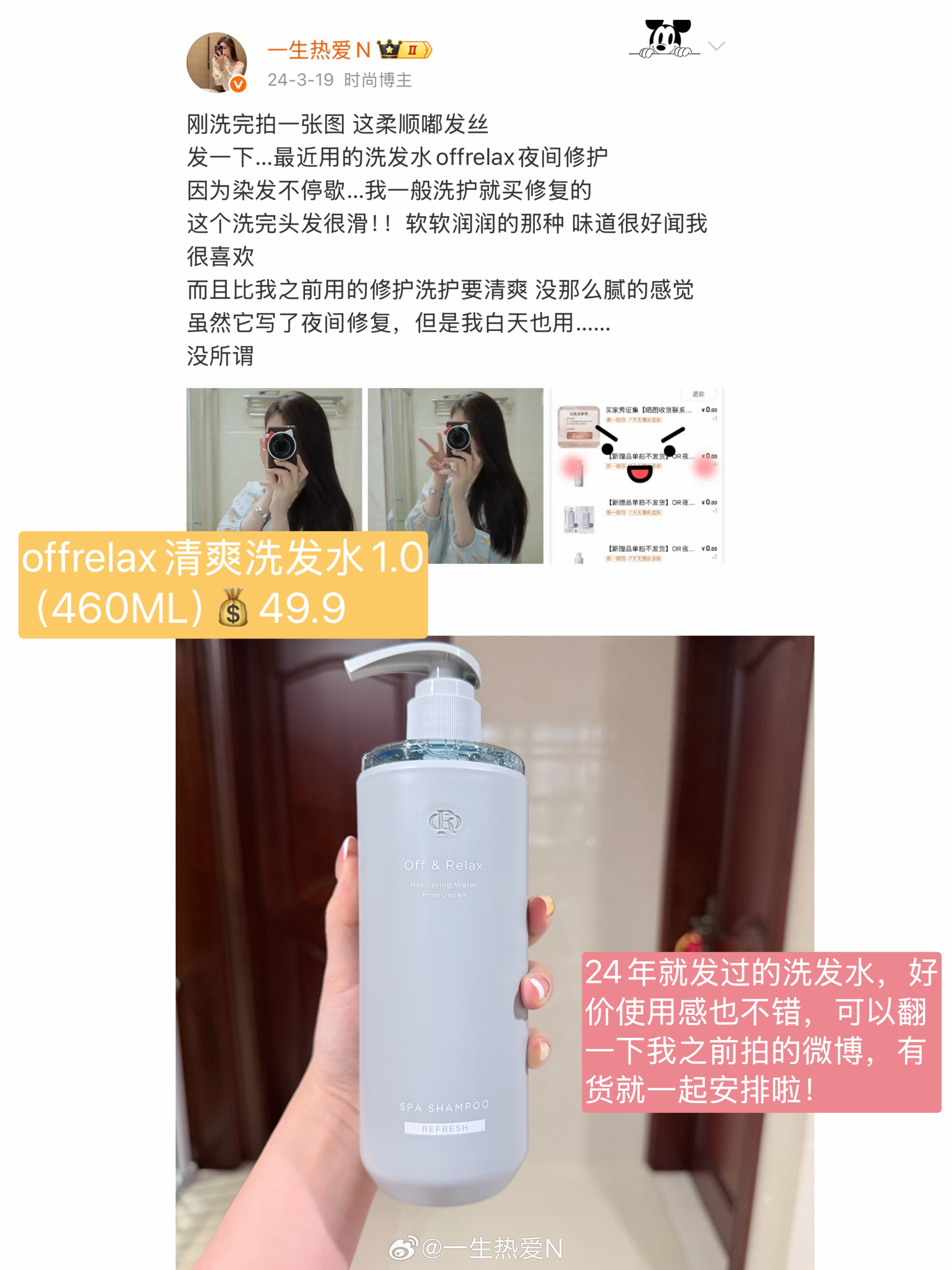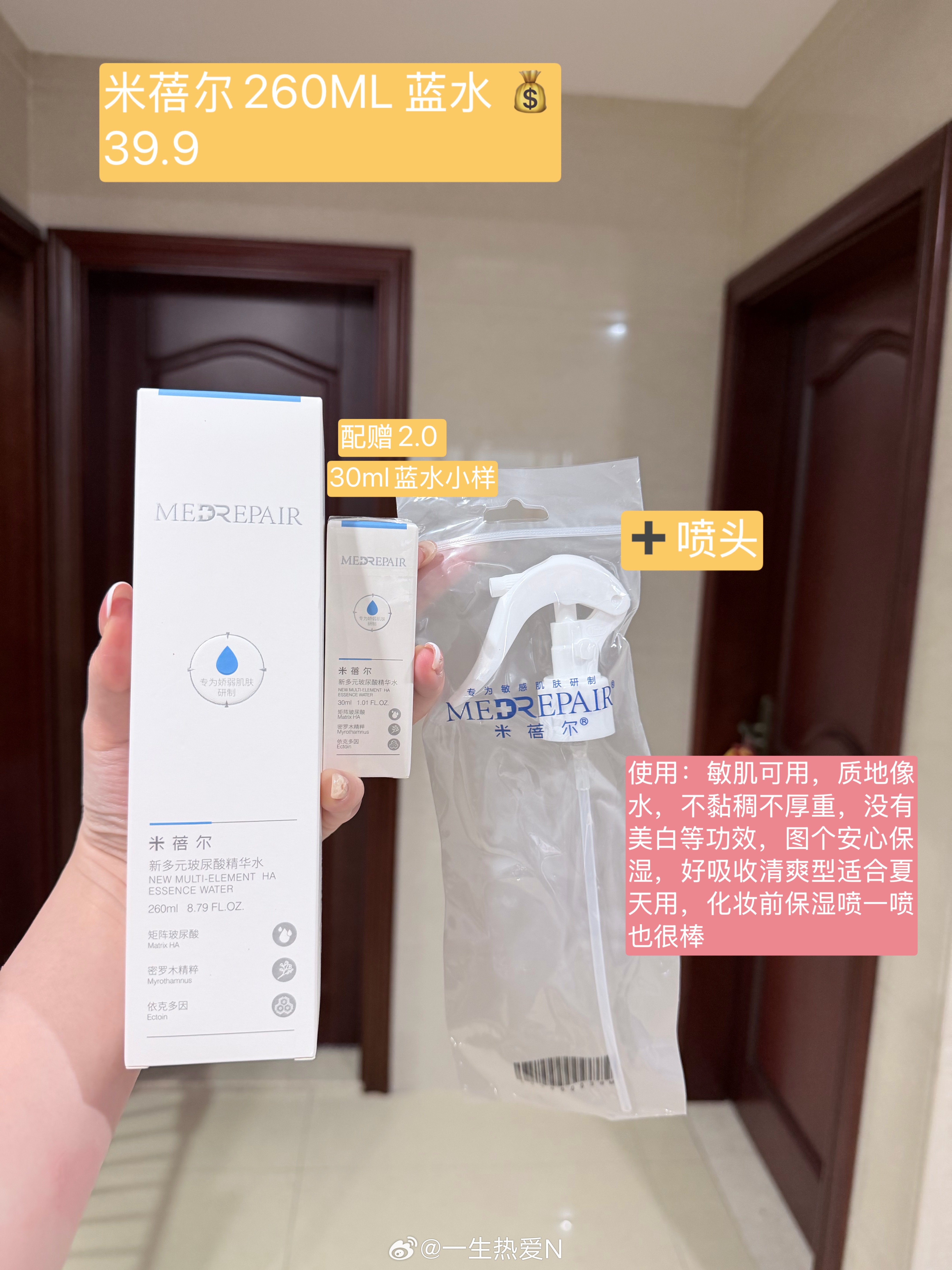 新品介绍✖️3(有需求的认真看一下哈时间紧不一一介绍啦!)1️⃣米蓓尔蓝水,很推荐的一款夏日补水,适合用于上妆前和洗澡后第一时间喷几下,尤其是方便上妆前的使用(很清爽好吸收我喜欢这种,喷头赠)2️⃣绽妍三重面膜,推荐点:价格适合囤货使用,由于蓝膜的溢价已经越来越高,也没办法有很好的团价了,所以这款同品牌的作为日常补水囤货我觉得蛮合适的,价格很ok3️⃣offrelax清爽洗发水1.0,24年就有发过这款洗发水,使用感不错清爽型的,价格不错一起抬上来,可以尝试看看(每个人的发质不同使用感不同哦,按需选择即可~)🔗依旧两个,团期10天,4.11即止🛒可以安排啦,明天开拍哟! 【4.1周三晚上20:00开团】 拍3包邮 菲菲 下下详情页