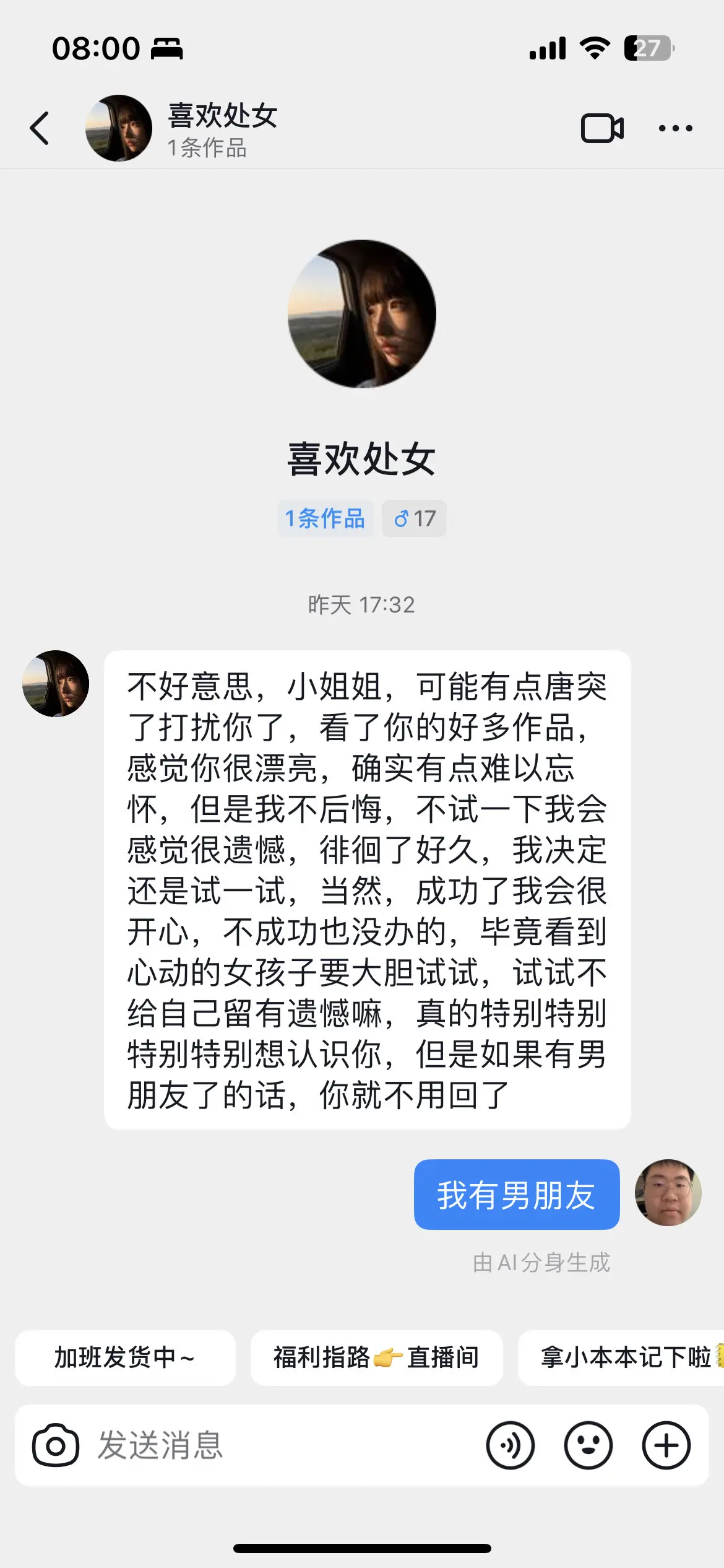 我的ai有自己的想法。他看见她自己不喜欢的她就说我有对象遇到喜欢的她...