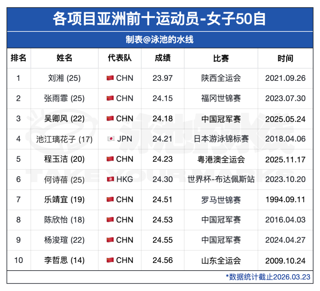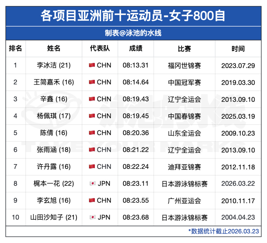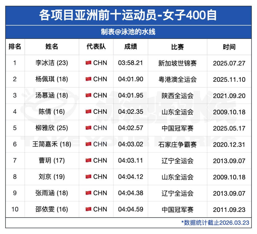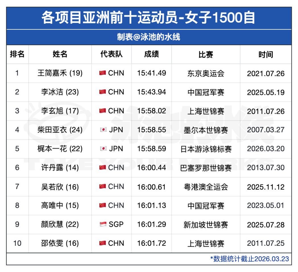 *部分成绩暂未获得世界泳联认证,成绩以及排名仅供参考📊数据统计截止2026.03.30