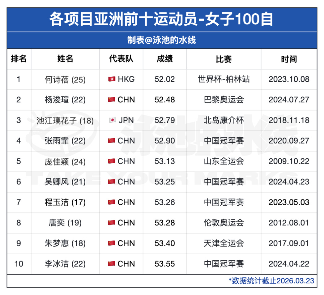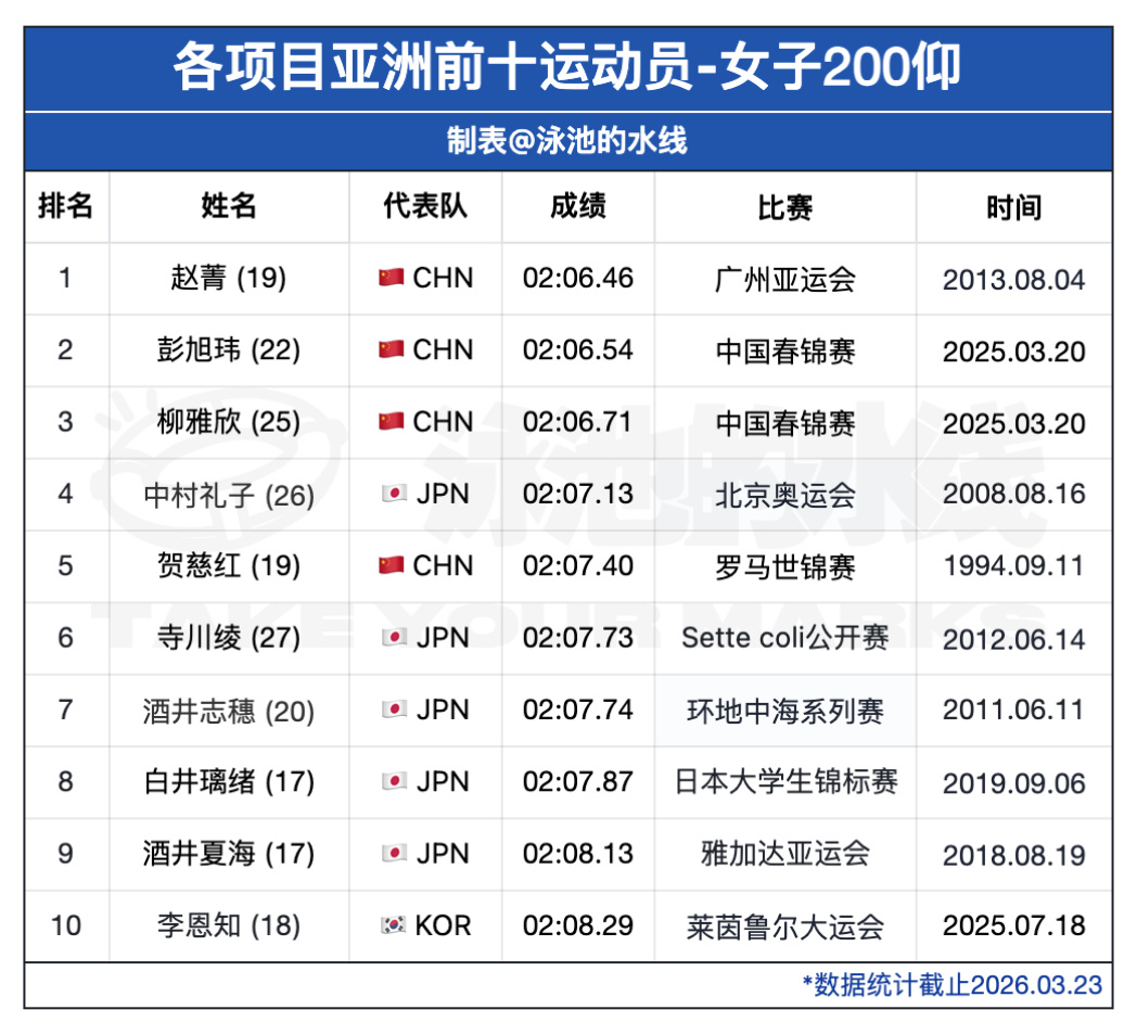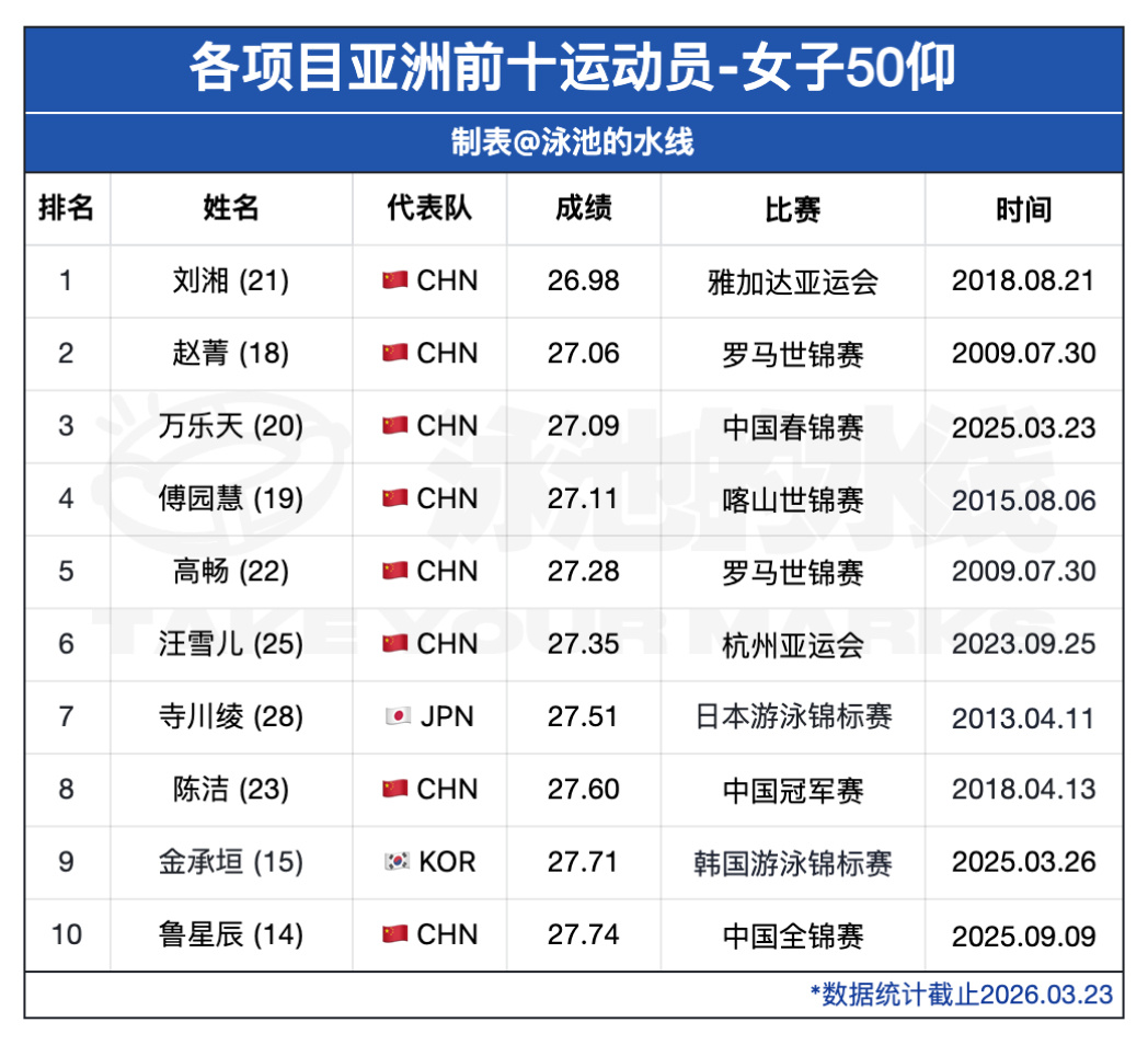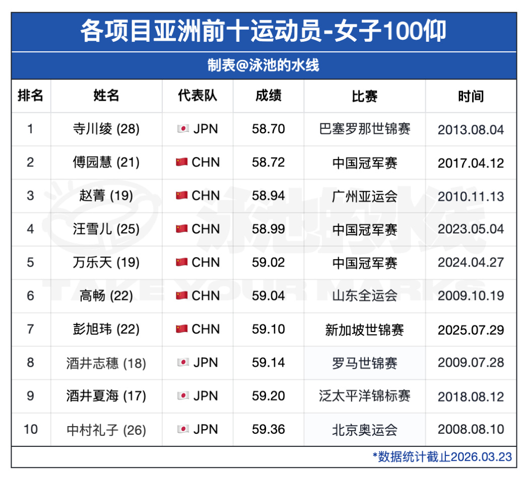 *部分成绩暂未获得世界泳联认证,成绩以及排名仅供参考📊数据统计截止2026.03.30
