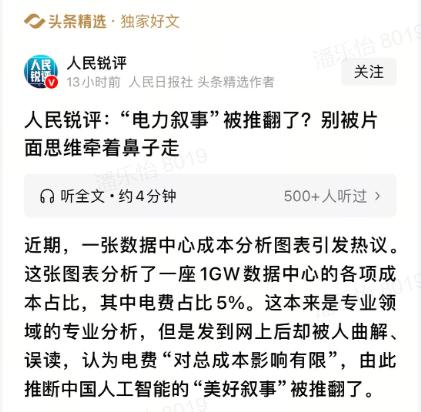 最近网上一张数据中心成本图引发了误会,说1GW数据中心电费只占5%,就有人曲解成中国AI的“电力叙事”被推翻了,其实这就是典型的片面看问题。 电力对AI发展来说,就像血液对人体一样,不能只看成本占比来判断重要性,哪怕血液占人体重量只有7%,却是缺一不可的。这种误读背后,是“只见树木、不见森林”的思维误区,抓住一点就放大,很容易误导舆论。 看待中国AI发展,得全面看。我们不否认在GPU上有差距,但也有自己的优势——比如美国OpenAI的Sora烧钱却赚不到钱,被迫关停,而中国的Seedance2.0却在短剧、特效等场景落地,很受欢迎,这就是我们超大规模市场和场景落地的优势。 不光是AI,这些年总有“中国崩溃论”“科技被封锁死”的错误说法,都是片面放大问题。比如有人说关税会逼走中国制造业,可事实是中国制造业全球占比稳居第一;说科技封锁会遏制创新,可中国创新指数已跻身全球前十。 中国发展是个复杂系统,只有全面、辩证地看,不钻牛角尖、不盲目自大,才能看清真实的中国优势,不被片面思维牵着鼻子走。