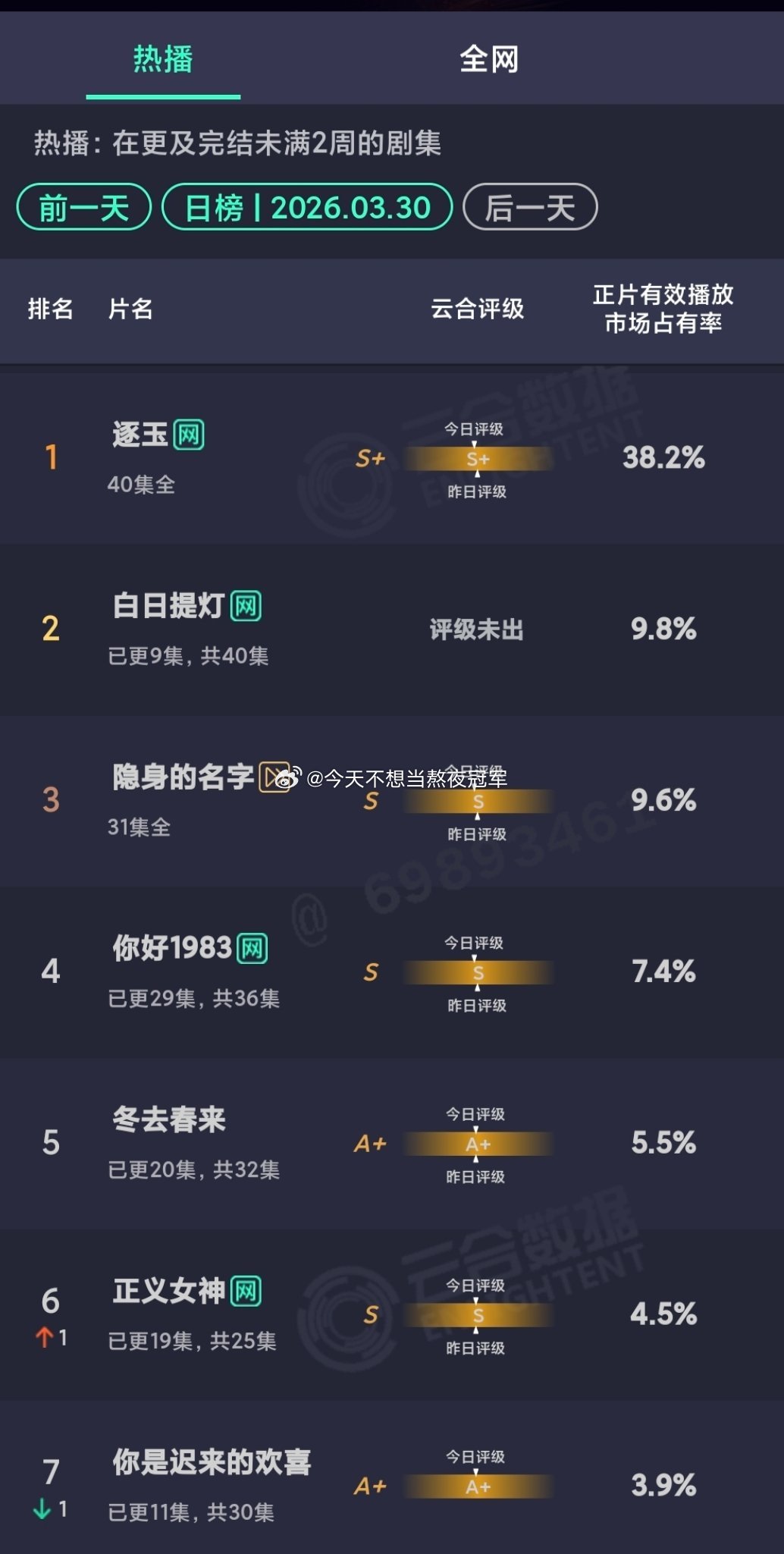 迪丽热巴 陈飞宇《白日提灯》第3日云合占比9.8%,预估播放量2300w左右