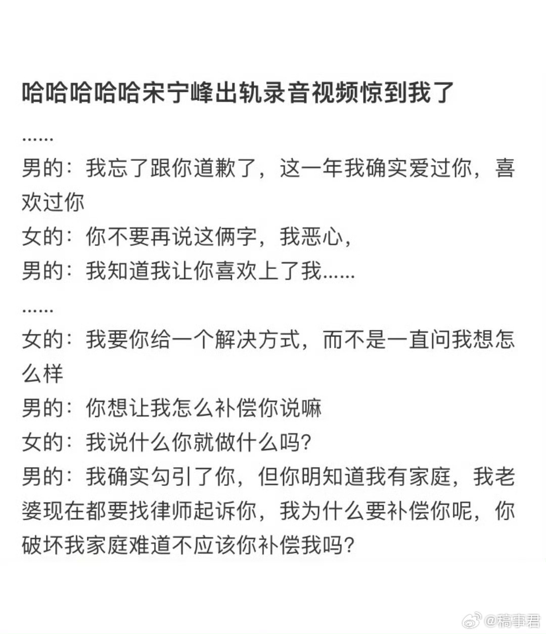 宋宁峰疑带着女儿出轨张婉婷老公宋宁峰被曝婚内出轨 真的难以想象抛开舆论纷争,仅从成人责任与亲子底线来看将未成年孩子卷入其中用作遮掩或陪同是对孩子保护意识的严重缺失成人欲望凌驾于孩童身心健康之上,突破大众对父亲身份最基础的认知与底线,无法共情
