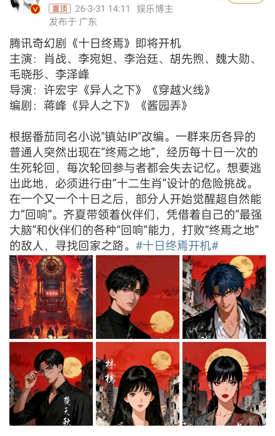 肖战准备进组十日终焉围读即将开机,网传主演阵容:肖战、李宛妲、李治廷、胡先煦、魏大勋、毛晓彤、李泽峰,你就说什么水平吧?