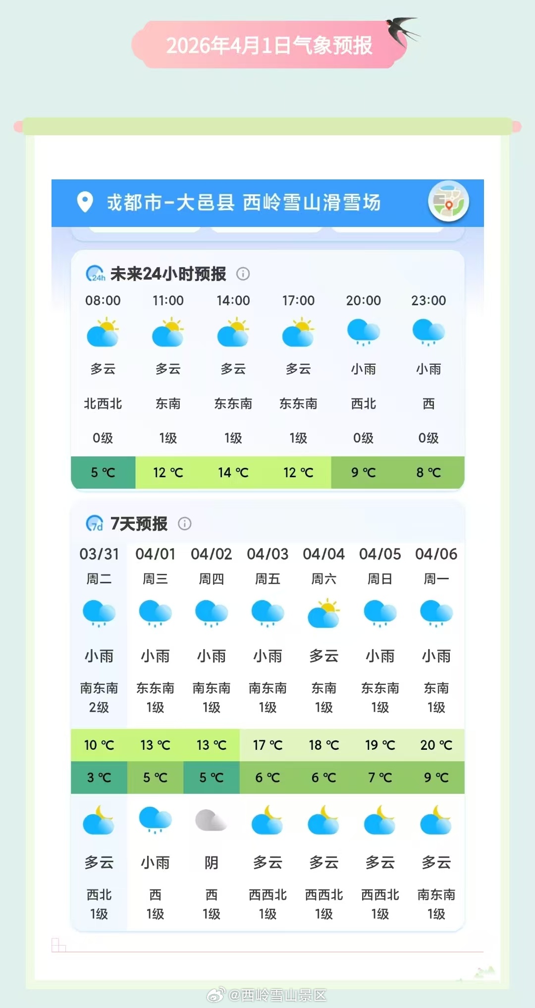 西岭雪山4月1日(周三)气象预报#西岭雪山 #