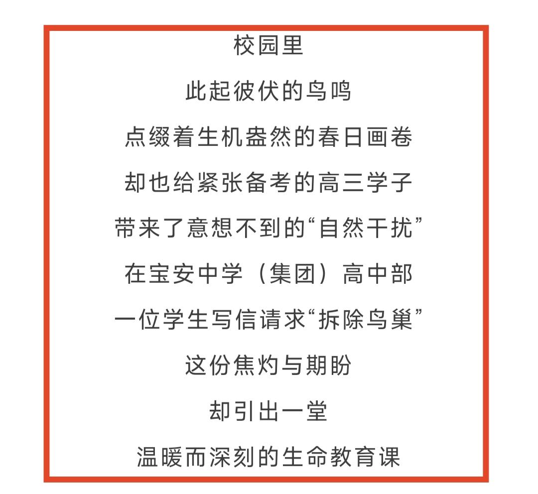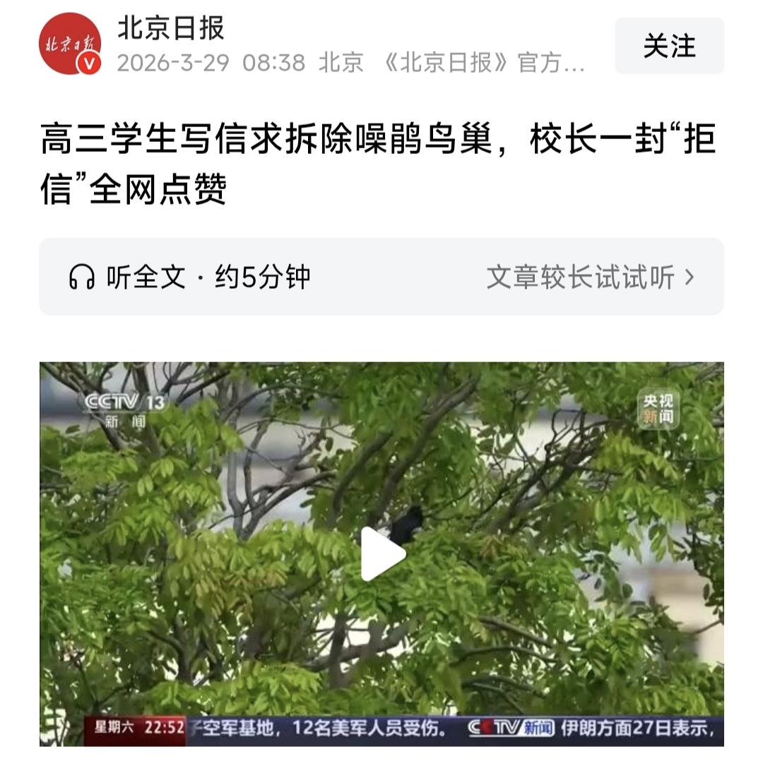下班了,同事们闲聊。正在这时,办公室窗外的噪鹃鸟又叫了,话题就转到了这种鸟的身上,它是目前深圳的网红鸟,因为深圳一所重点高中的校长回复高三学生拆鸟窝的信,引发了一场全网的生命教育课。 “教育的终极目标,不是让世界适应我们,而是让我们学会与世界相处。”这位高中校长的一席话,引起全网怒赞,教育就应该是这个样子,高考很重要,但不能什么事情都给高考让步。 有点赞,当然也有质疑,这件事情站在不同的角度,可能会得出不同的结论。下班我就问了一位同事,你怎么看这件事情? 她是这样回答的,站在校长和网友的角度,校长这样做无可厚非,校长站在比较高的高度,利用这件事情对学生进行生命教育,让学生去适应自然,与自然共处,同时也要一定的定力和抗干扰能力,因为以后还会碰到很多这样的事情,不可能都去改变环境,也不能总是抱怨环境。 但站在家长的角度和一部分学生的角度,可能感觉是完全不一样的。虽然是一个学生写信,这封信可能代表了相当一部分学生的感受和困惑,而这种困惑可能已经持续了一段时间了,因为这种鸟叫声的确很犀利,穿透力很强。所以站在高三家长的角度,家长或许会说校长啊,这个首先不要讲大道理,先想办法,能不能降低一下这种鸟噪音的影响,即便不挪鸟窝,可以想想其他办法,比如先想到的就是安装双层隔音玻璃,而且这可以一劳永逸的解决问题,明年鸟儿来了,它还可以在外面畅快的叫,而高三学生在教室里面安静的学习,这才是与自然和谐相处之道。 我们不要去试图改变鸟儿的生活环境,但我们可以改善自己的环境和鸟儿的环境共处。 她说话的大概意思是这样的,我觉得挺有道理,也比较理性。 这种事情让我有一点担心,有些时候我们会不会以很高大上的理由表面上非常正确的理由给懒政找到理由,不去做事情。比如说教室空调坏了学生感到很热,我们会说这点苦都受不了,将来还能干什么,从而无所作为等等。这种温暖的懒政,其实有时候让人挺难受的,因为你既知道他没有解决问题,又不知道该怎么去反驳。