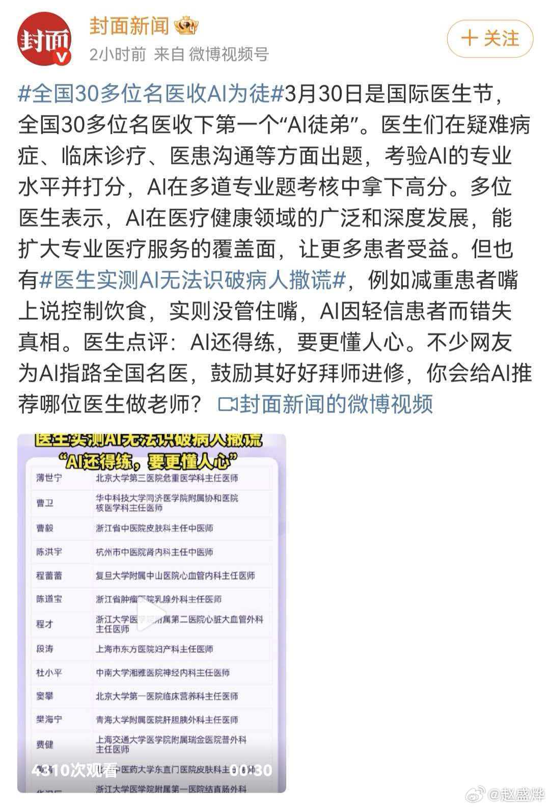 全国30多位名医收AI为徒 AI赋能医疗是未来具身智能发展的重要方向,众所周知的,医疗问诊因为其复杂性和高安全要求,已经成为AI研发企业的重要挑战领域。依靠人工辅助大模型训练是一个很好的思路,应该能做出来比较好的成绩。不过AI未来如果有了心智的话,其内心OS可能会说:等我练熟了,把你们都拍在沙滩上,让你们都回家养老! 医生实测AI无法识破病人撒谎