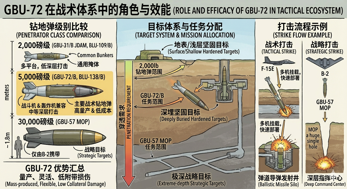 GBU-72定位为中型钻地弹,穿透能力强于2000磅级BLU-109型,但小于GBU-57 MOP(30000磅级,主要由B-2携带,用于极深地下核设施)。它提供成本效益更高的选项,尤其适合战术级或中等规模任务。