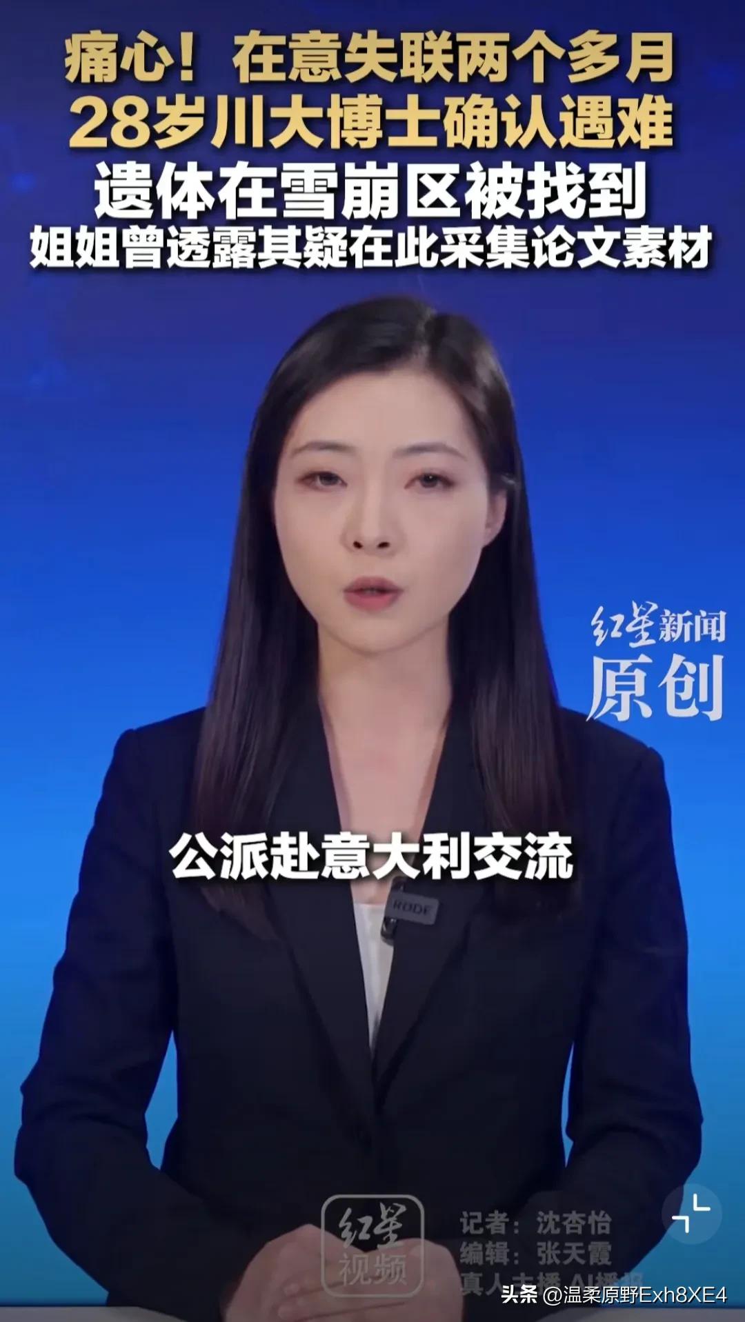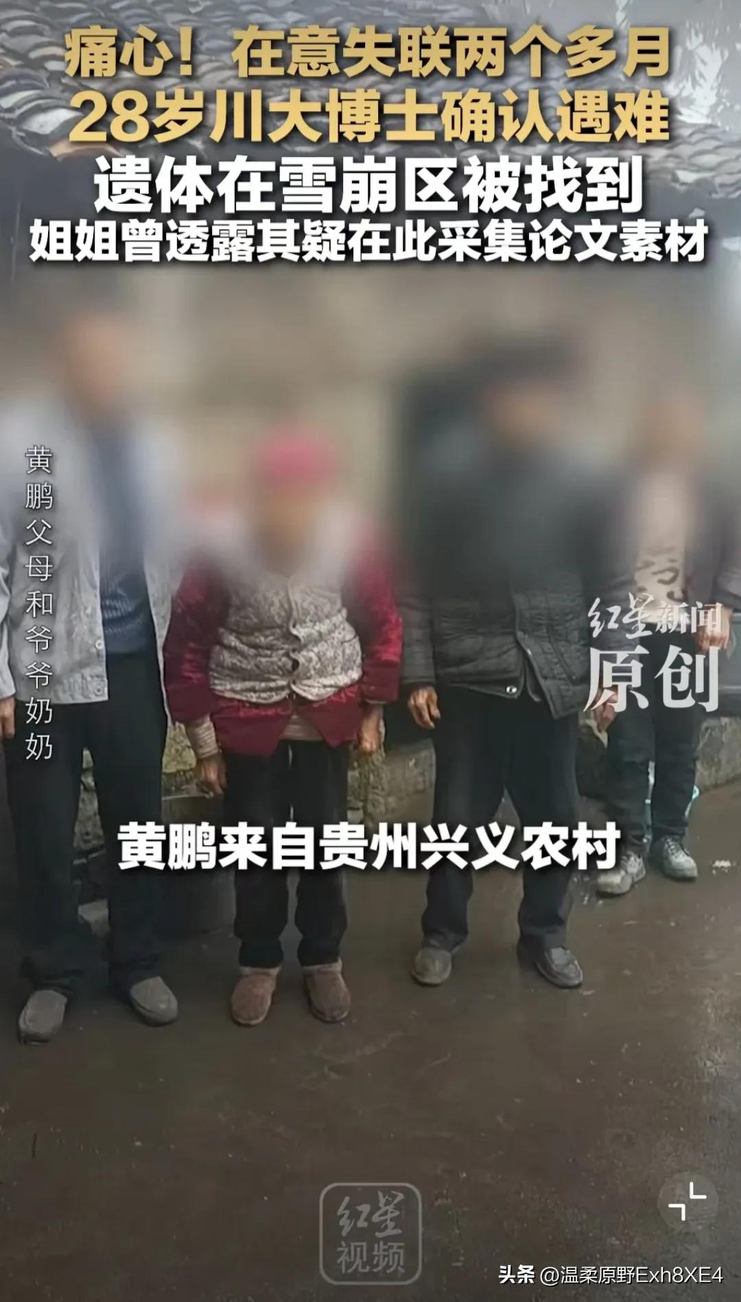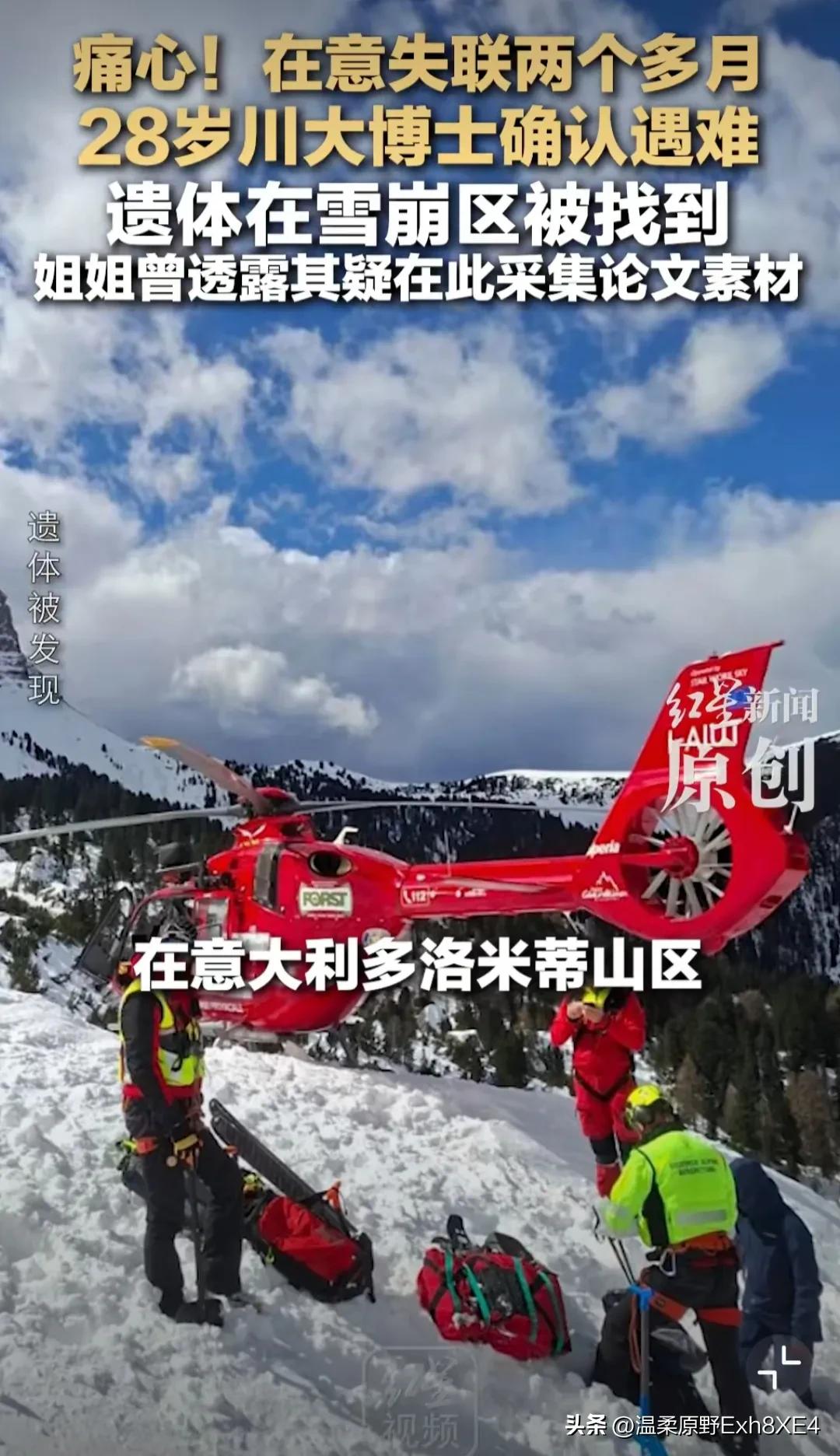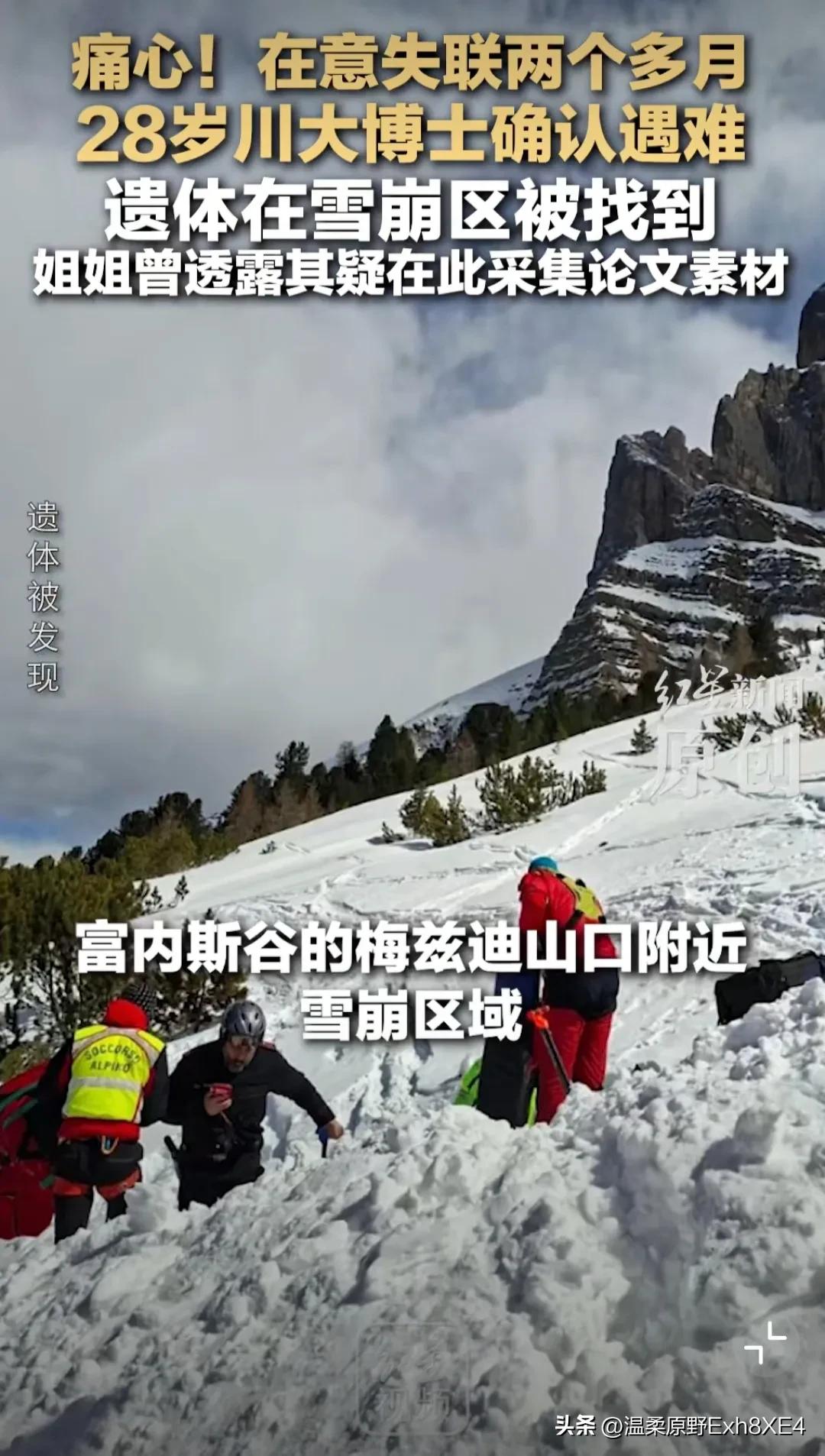 可惜,看了真让人唏嘘不已!一位28岁中国博士生,失踪两个月后,遗体在意大利富内斯谷梅兹迪山口附近的雪崩区域被找到。家人痛哭,无奈至极。 这位博士生黄鹏出身农村,家境贫寒,是父母靠在工地“一块砖一块砖搬”供出来的。他个人也十分优秀,25年被公派至意大利进行学术交流,研究“技术促进可持续性和生物科技”。而且今年就能博士毕业,本应迎接美好未来的,唉[泣不成声] 据悉,黄鹏是去那个地方采集论文素材的,大学时有过户外徒步经验。 网友:农村,公派博士,28岁,光这些词就能触动人心。于父母于国家于社会而言,都是十分惋惜的。