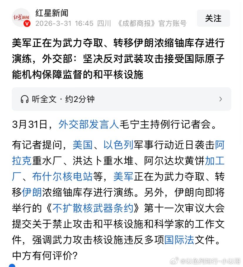 ‼️中国的态度毛宁说,武装攻击接受国际原子能机构保障监督的和平核设施,违反联合国宪章宗旨、国际法和国际原子能机构规约,严重冲击不扩散核武器条约的权威,削弱维护国际核不扩散体系的努力,可能给地区和平安全与稳定带来严重后果。中方对此坚决反对,主张通过政治外交手段和平解决伊朗核问题,呼吁各方保持冷静克制,避免紧张局势进一步升级不扩散。毛宁说,《不扩散核武器条约》第十一次审议大会即将举行,中方关切美国、以色列军事打击行为的消极影响。中方愿同各方一道,继续秉持客观公正立场劝和促谈,支持通过对话谈判解决伊朗核问题,切实维护国际核不扩散体系,促进中东地区和平与稳定。伊朗最大岛屿遭美以袭击