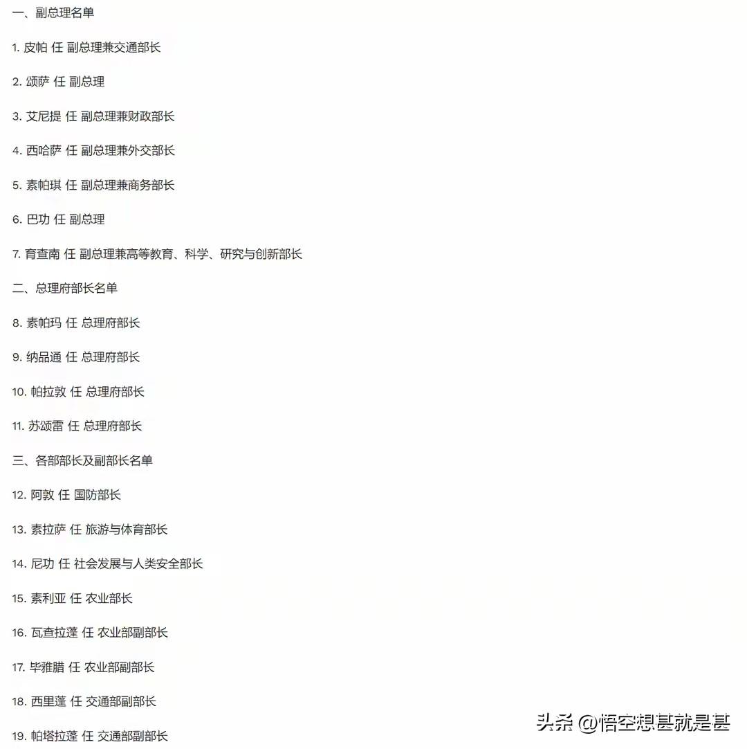 今天,泰国总理阿努廷组阁成员得到泰王御批,意味着以阿努廷为首的泰国政府新内阁完成组阁。内阁成员及所担任的职务和之前媒体释放出来的消息差距不大。 阿努廷担任总理及内政部长,和在上届政府中担任的职务相同,泰国的内政部是一个重要部门,内政部主管警务系统、地方官员任命权等。 为泰党裕差南在总理内阁中担任副总理兼高等教育、科学、研究与创新部长,另外为泰党在总理内阁中还有4名部长和3名副部长,共计8人进入阿努廷的总理内阁,佩通坦没有进入内阁,但是目前依然是为泰党党员。(个人观点,不喜勿喷,谢谢!)
