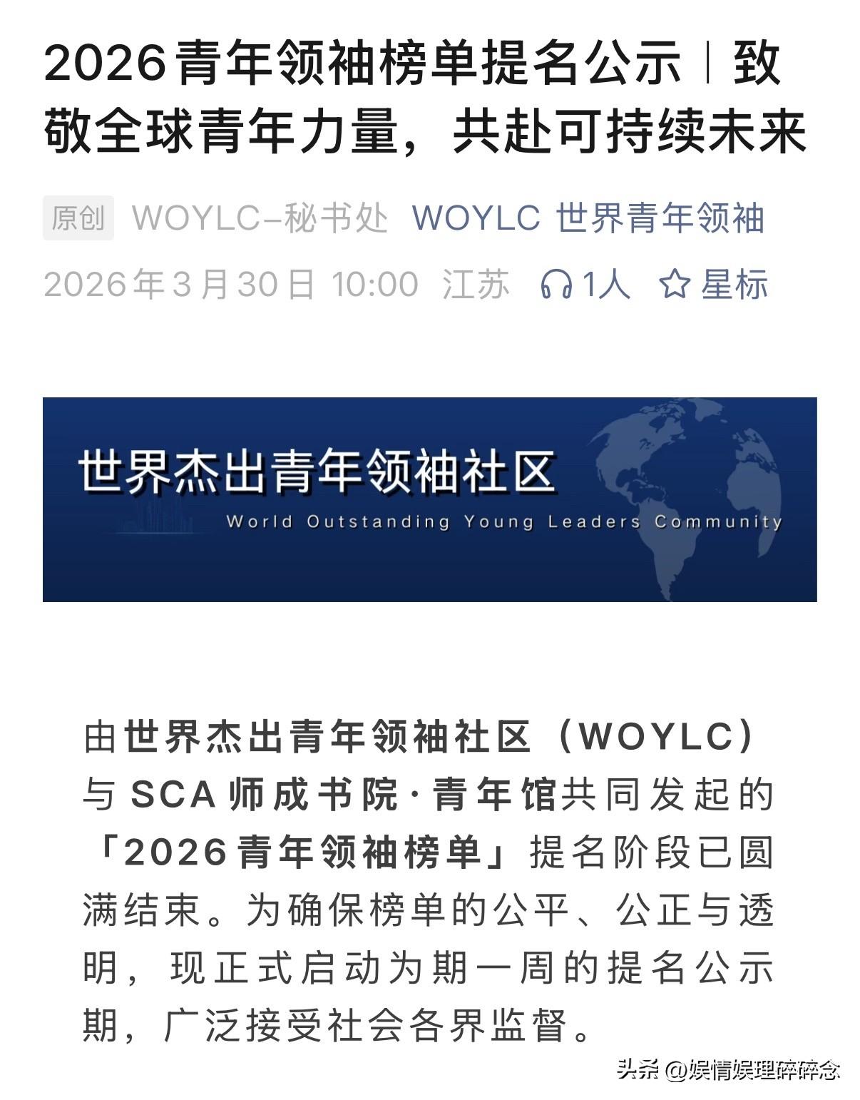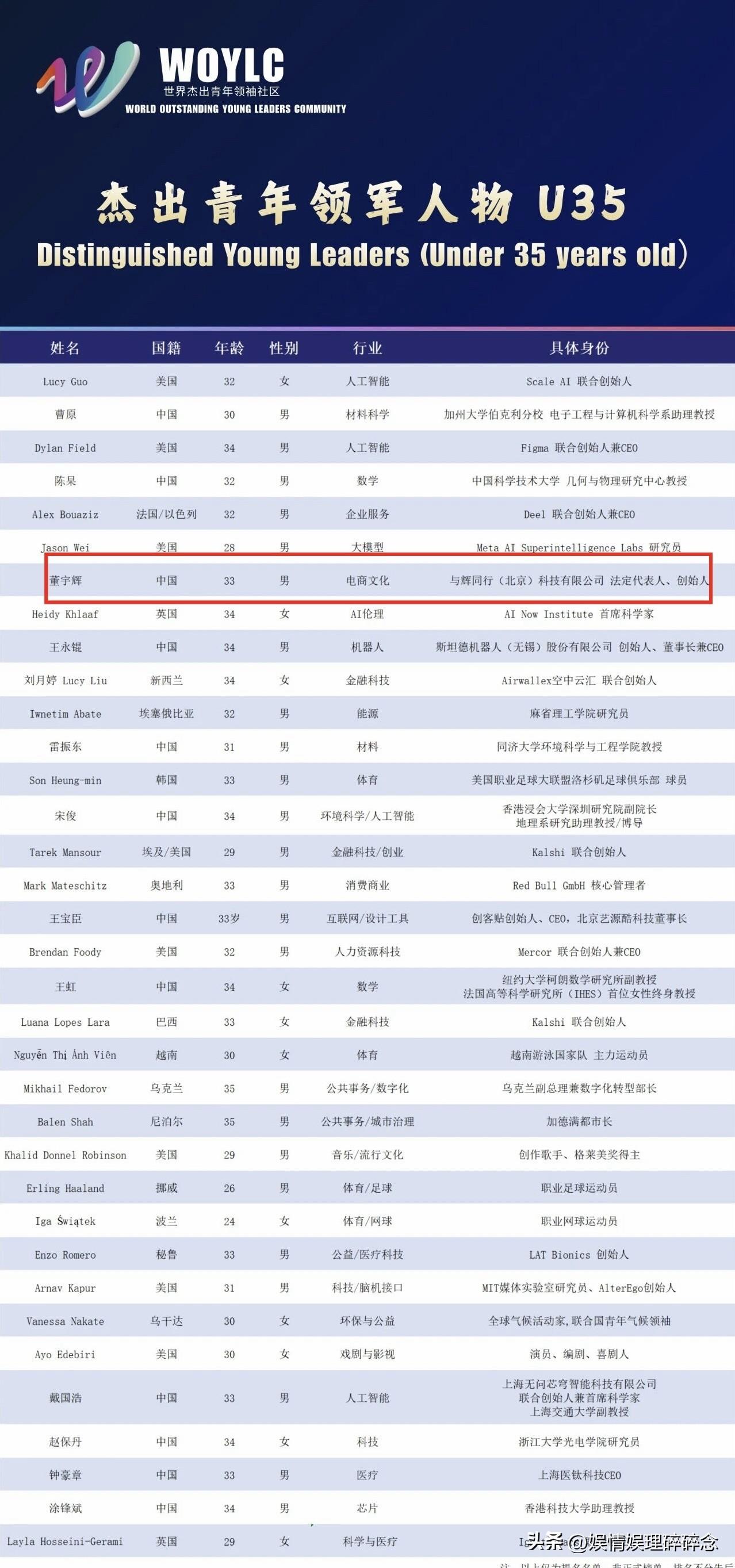 这才是青年该有的样子! 2026青年领袖榜单提名公示, 董宇辉的名字出现在“杰出青年领军人物(U35)”行列,我们由衷的为他感到骄傲! 在这份榜单里,有AI领域的顶尖学者、科技行业的创业先锋、体育界的世界冠军,而董宇辉的出现,恰恰证明了:青年的影响力,从来不止于实验室的突破、赛场的夺冠,更在于用自己的力量,去改变一个行业,去温暖一群人! 33岁的他,用“与辉同行”重新定义了直播电商,这份提名,是对他用行动践行青年担当的最好认可,也是对他未来的期许。 恭喜宇辉,实至名归,期待最终榜单!