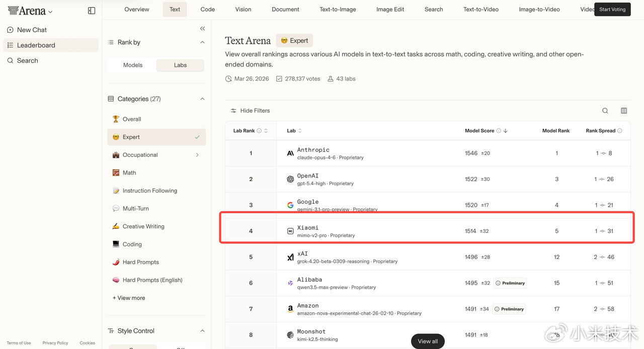 另外在Text Arena (Arena Expert) 评测中,MiMo-V2-Pro 在Model Rank(模型排名)维度进入了全球前五,在它前面的是OpenAI、Google等世界顶级模型
