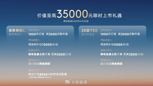 这次上新的26款T60、全新星际L和26款星际EV,精准覆盖商用、作业全场景,从7.98万到24.98万的价格段选起来很方便。现在下订还有5重礼遇,综合权益最高3.5万,动力总成还终身质保,用车成本直接拉低。更贴心的是推出7天免费试用,先开再买太靠谱了。