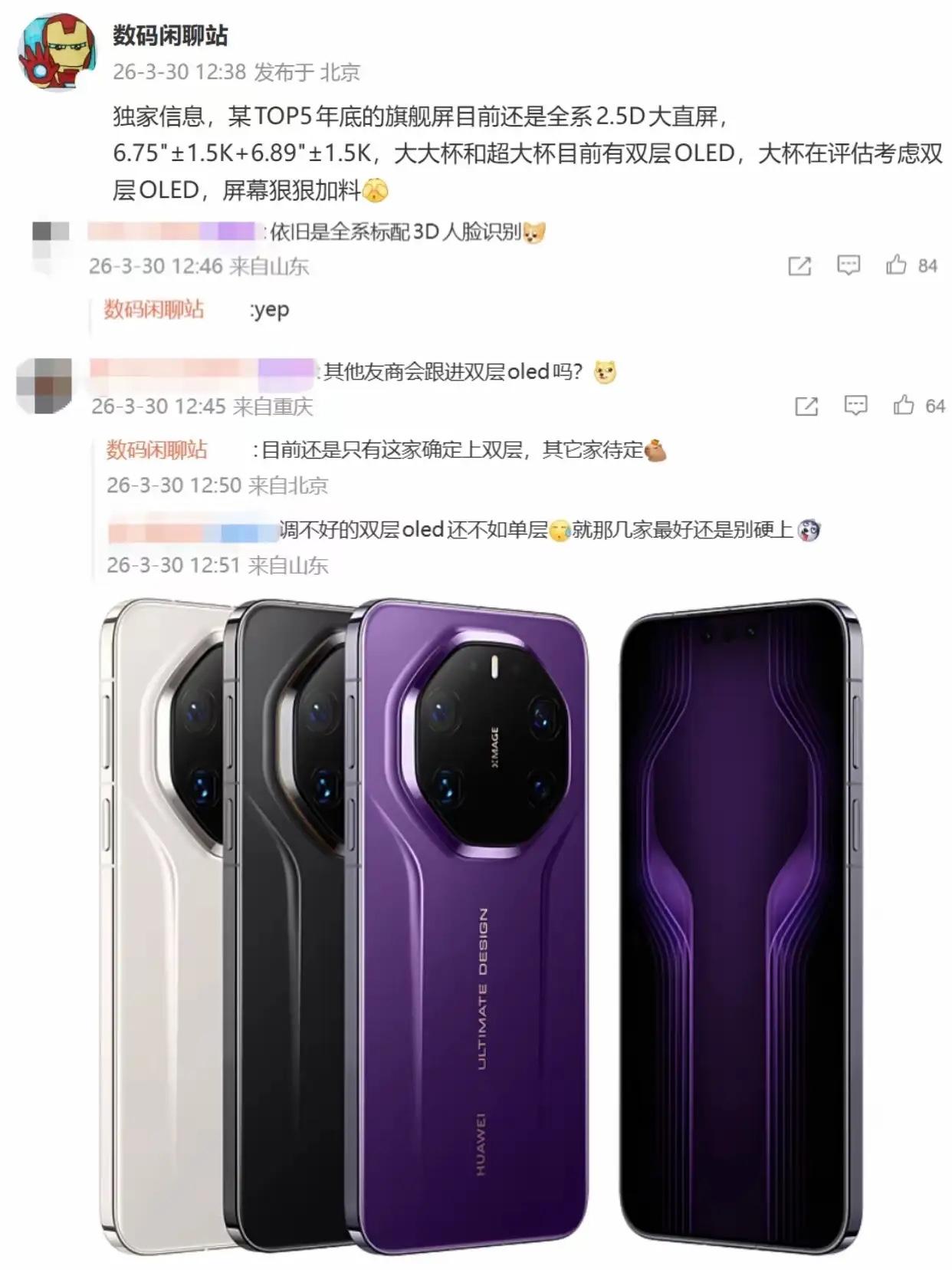 不但美国震惊了,日本、德国等西方列强也震惊了,就连马斯克想了三天三夜也弄不明白,中国在西方构筑的铜墙铁壁之下也能取得突破性的成就!西方国家已经认识真相,中国已经从当初的”追赶者“变成了”引领者“,他们不得不承认,只有与中国合作才能取得突破,这是谁也无法改变的事实,华为将彻底改写历史。华为Mate 90系列终于要来了 兄弟们,终于等到了!华为Mate 90系列这只“猛兽”真的要出笼了。 根据供应链最新爆料,Mate 90系列预计在2026年9月到11月发布,依然是年度压轴大戏。 这一次,华为不是在做常规升级,而是在堆料上彻底“杀疯了”,从芯片、屏幕到电池,全是颠覆性的黑科技。 如果说Mate 80是站稳了高端,那Mate 90就是要把行业天花板给掀了。 咱们直接聊干货,看看这代机皇到底猛在哪: 第一,屏幕终于“完美”了。 这可能是全球第一款真正意义上的“真全面屏”。Pro和Pro Max版本大概率会干掉挖孔,采用屏下3D结构光+屏下摄像头技术,屏占比直接干到95%以上。 这块屏幕是京东方的Tandem双层OLED,峰值亮度飙到8000尼特,什么概念? 就是大太阳底下看导航都清清楚楚。 而且它支持1-144Hz LTPO自适应刷新,还覆盖了100% BT.2020色域,这色彩显示比现在的旗舰机还要广30%,看电影简直是享受。最狠的是,它还标配了第三代昆仑玻璃,耐摔性能提升了300%,再也不用贴膜戴壳了。 第二,性能是真的“封神”。 这次麒麟芯片回归全链路自主可控。 标准版用麒麟9030 Pro,Pro版上麒麟9040,而顶配的Pro Max和RS非凡大师版,很可能会搭载基于2nm工艺的麒麟9040 Pro。 安兔兔跑分预计突破160万,甚至有工程机测到了300万的综合跑分,CPU性能比上代暴涨40%,GPU支持光线追踪,玩《原神》这种3A大作满帧运行,温度还能控制在43度以内。 再加上全系标配16GB LPDDR5X起步,顶配24GB内存(含扩展),配合鸿蒙OS 7.0的“端云协同AI”,后台挂几十个应用都不杀后台,用个五六年绝对不卡。 第三,续航彻底治好了“焦虑症”。 这次Mate 90 Pro Max据说要首发全固态硫化物电池,容量干到7500mAh! 能量密度比传统锂电池高40%,而且在零下20度的极寒天气里,电量衰减不到10%,北方冬天出门再也不怕手机冻关机了。 快充也是120W有线+80W无线的组合,十几分钟就能回血大半。 第四,影像依然是“夜视仪”。 XMAGE红枫影像进化到2.0版本,Pro Max版用上了1英寸超大底主摄,进光量提升40%,配合双潜望长焦,实现3-12倍连续光学变焦,最高100倍数字变焦。 这意味着你拍月亮、拍远处的风景,细节直接拉满,不再是“数码裁切”。 最后是通信和防护。 华为的老本行不能丢,5.5G(5G-A)万兆网络、Wi-Fi 7、双向北斗卫星消息和天通卫星通话全系标配,没信号的地方也能救命。 机身用上了航天级钛合金中框,防水防尘等级达到IP68甚至IP69K,暴雨冲、开水烫都不怕。 价格方面, 预计标准版4699元起,Pro版6999元起,顶配RS版可能冲击1.6万元。 总的来说,华为Mate 90系列不仅是硬件的堆砌,更是国产供应链的一次总爆发。真全面屏、2nm芯片、全固态电池,每一项都是王炸。 对于想换机的朋友,我的建议是:如果你追求极致体验,闭眼冲Pro Max;如果预算有限,标准版的配置在同价位也是乱杀。这波啊,华为是真的把“高端”两个字刻进了DNA里。