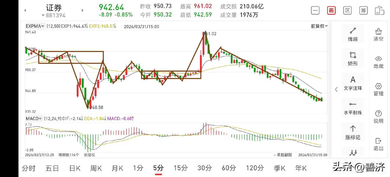 证券板块晚评(2026.3.31) 今天下午,证券板块还是延续了一个下跌,但就是在底部区间反复的震荡而已,此处的风险已经几乎释放殆尽了,预计后面一段时间还是一个反复震荡的过程,操作上可考虑持股观察即可。 1.从30分钟图一上看,依旧是围绕最后一个30分钟中枢做上下震荡,并没有出三卖,也就是没有卖点出来,那它就没有走坏,在没有走坏的情况下,是无需考虑操作的,就是一个持股等待的过程。所以这里不管后面是否破新低,都是安全的,尤其注意的是,目前任何一笔回踩哪怕再次破新低都是具备拉大阳线的能力的,操作上可考虑锁住筹码,等待上涨。 2.从5分钟图二上看,下午的一笔回踩力度还是比较强的,而且还没有5分钟的中枢,所以目前来看,这笔30分钟回踩是没有结束的,尽管如此,但它还是没有破新低,还是30分钟的二买,仍旧具备强势拉升的能力,而且从一分钟上看,已经出现了三个一分钟中枢的趋势背驰,是有反转条件的,所以下周一看技术性反弹,还是那句话,不管它在此处如何震荡,乃至再次破低,风险都是极小的,代价就是耗时间,或许这就是慢牛最磨人的地方吧! 总之,此处机会远大于风险,耐心持股观察即可。券商策略解读 股评,对炒股到底有帮助吗?