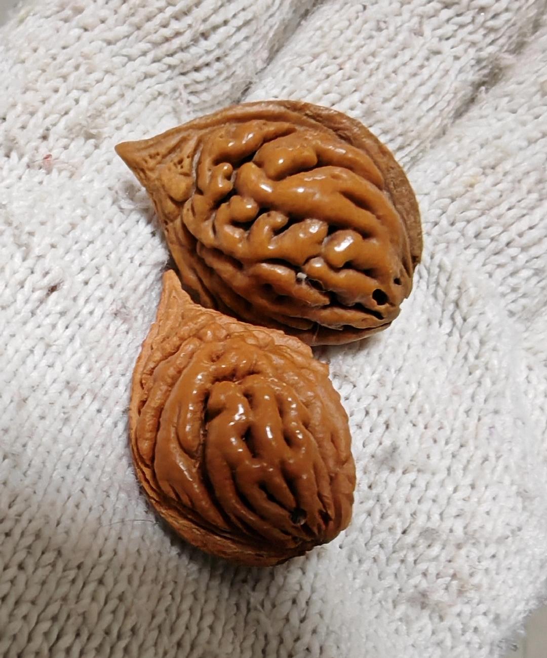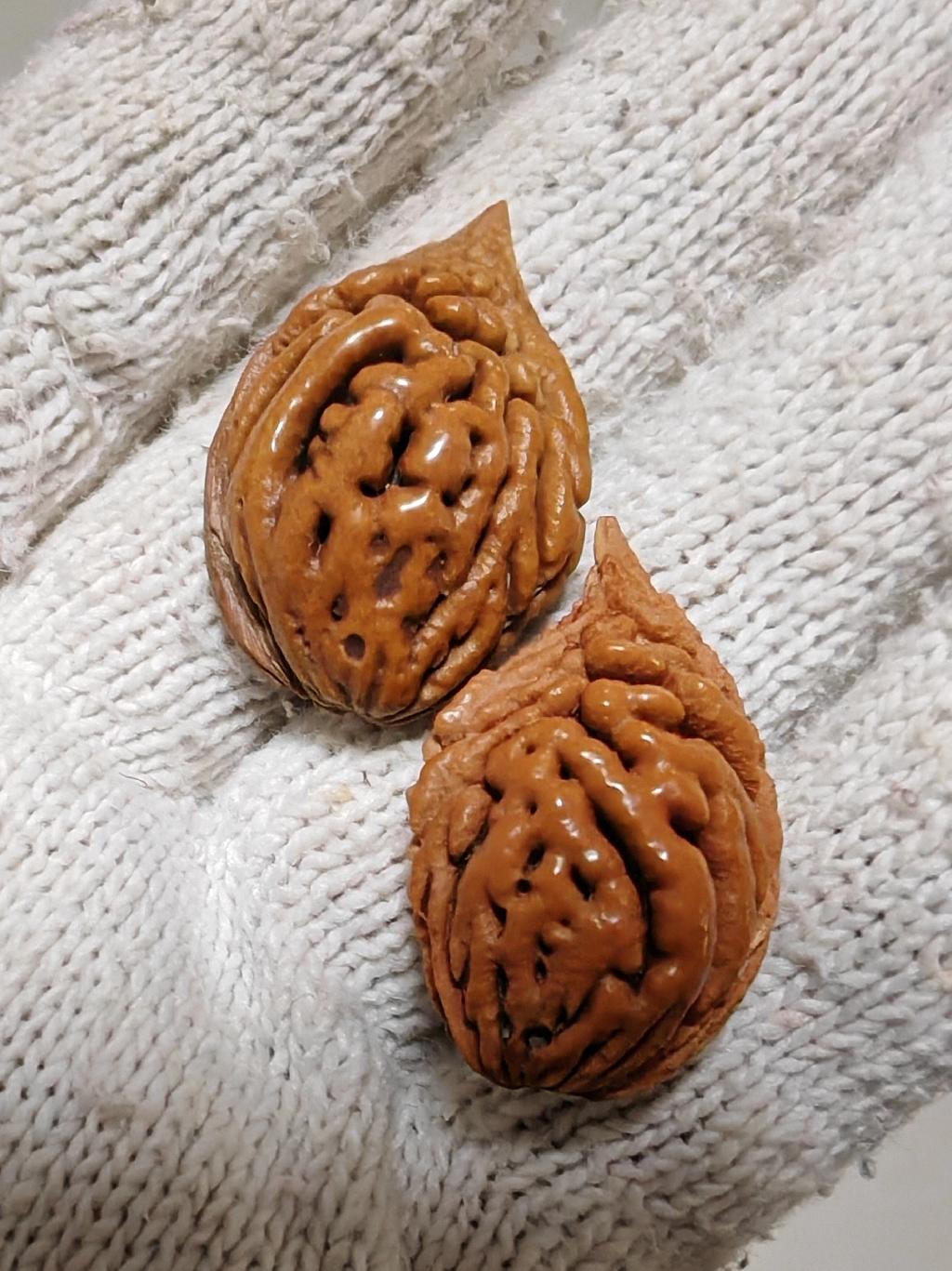 桃枭在桃树上经历了整个冬天,摘下后清理干净。 由于桃核历经风霜,已经木化透了,所以上色特别快! 这两枚桃枭清理后,带手套盘了几天,就如此的漂亮了!辟邪桃枭