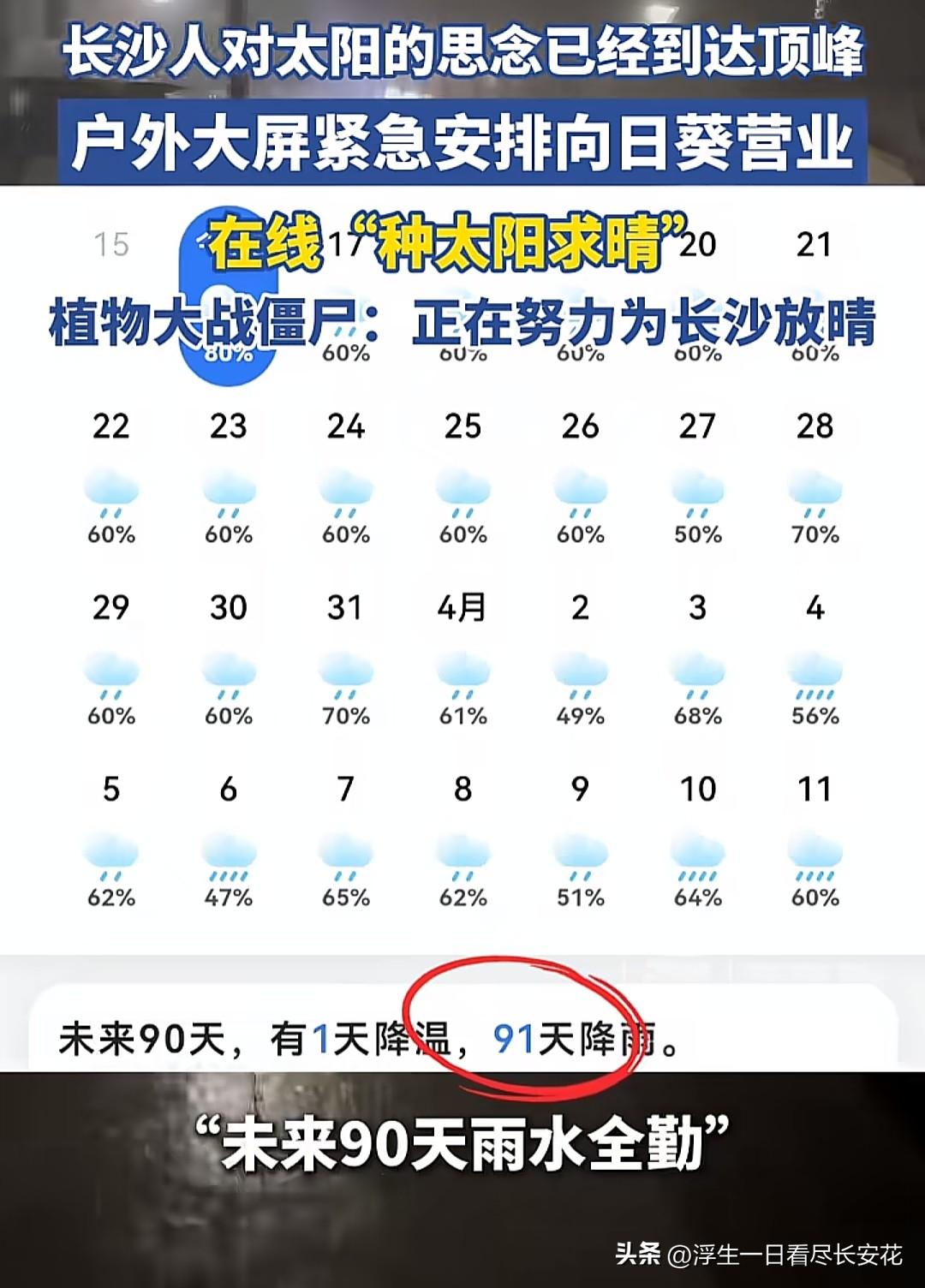 长沙待了5年,广州待了6年。长沙冬天比广州冷,夏天比广州热,雨季比广州长,唯一优点就是没有台风。 最近刷到长沙户外大屏循环播放《植物大战僵尸》里的向日葵“种太阳”,瞬间就懂了长沙人的无奈。看看那天气预报,未来90天几乎天天下雨,说“雨水全勤”都不夸张,也难怪长沙人会用这种方式“求晴”。在长沙待的那5年,雨季的记忆尤其深刻,洗好的衣服挂在阳台,一周过去摸起来还是潮乎乎的,连带着心情都跟着发闷。 对比在广州的6年,虽然夏天也热,但至少雨季不会这么“黏人”,偶尔还能盼着台风天来个短暂降温。不过长沙也有广州比不了的好处,至少不用在台风天担心窗户被吹破,不用提前囤好食物在家“避难”。 其实不管是长沙还是广州,每个城市的天气都有让人吐槽的地方,可待久了,也就慢慢习惯了这种“爱恨交织”。就像长沙人在雨季里盼太阳,广州人在台风天里盼安稳,日子就在这种小小的期盼里一天天过着。 对此,大家怎么看呢?欢迎留言。